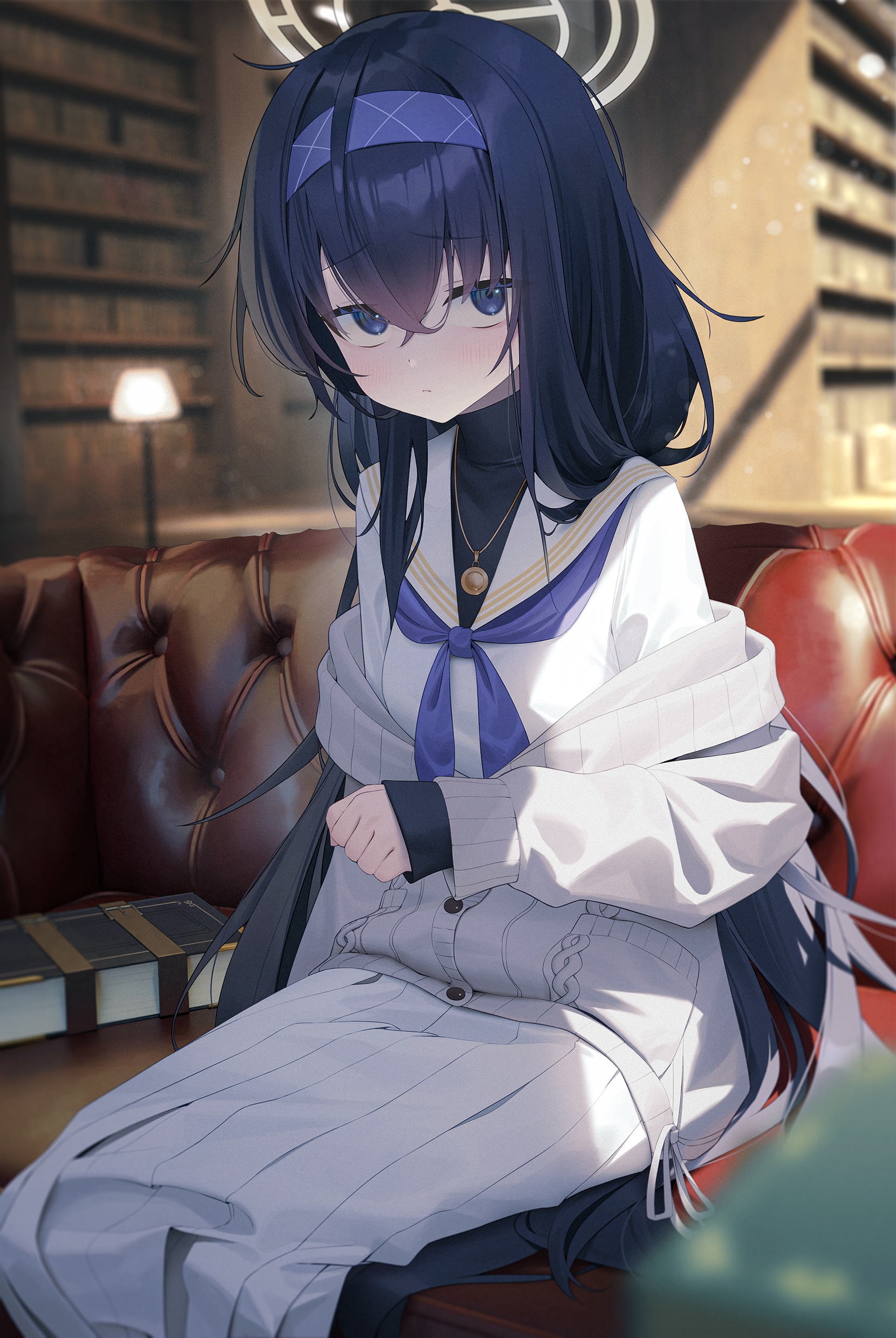 1girl absurdres aya_(lezon) bags_under_eyes black_hair black_shirt blue_archive blue_eyes blue_hair blue_hairband blue_neckerchief blurry blurry_background blurry_foreground blush bookshelf cardigan couch dark_blue_hair depth_of_field gradient_hair grey_cardigan hairband halo highres library long_skirt long_sleeves looking_at_viewer multicolored_hair neckerchief on_couch pleated_skirt school_uniform serafuku shirt sideways_glance sitting skirt solo ui_(blue_archive) white_serafuku