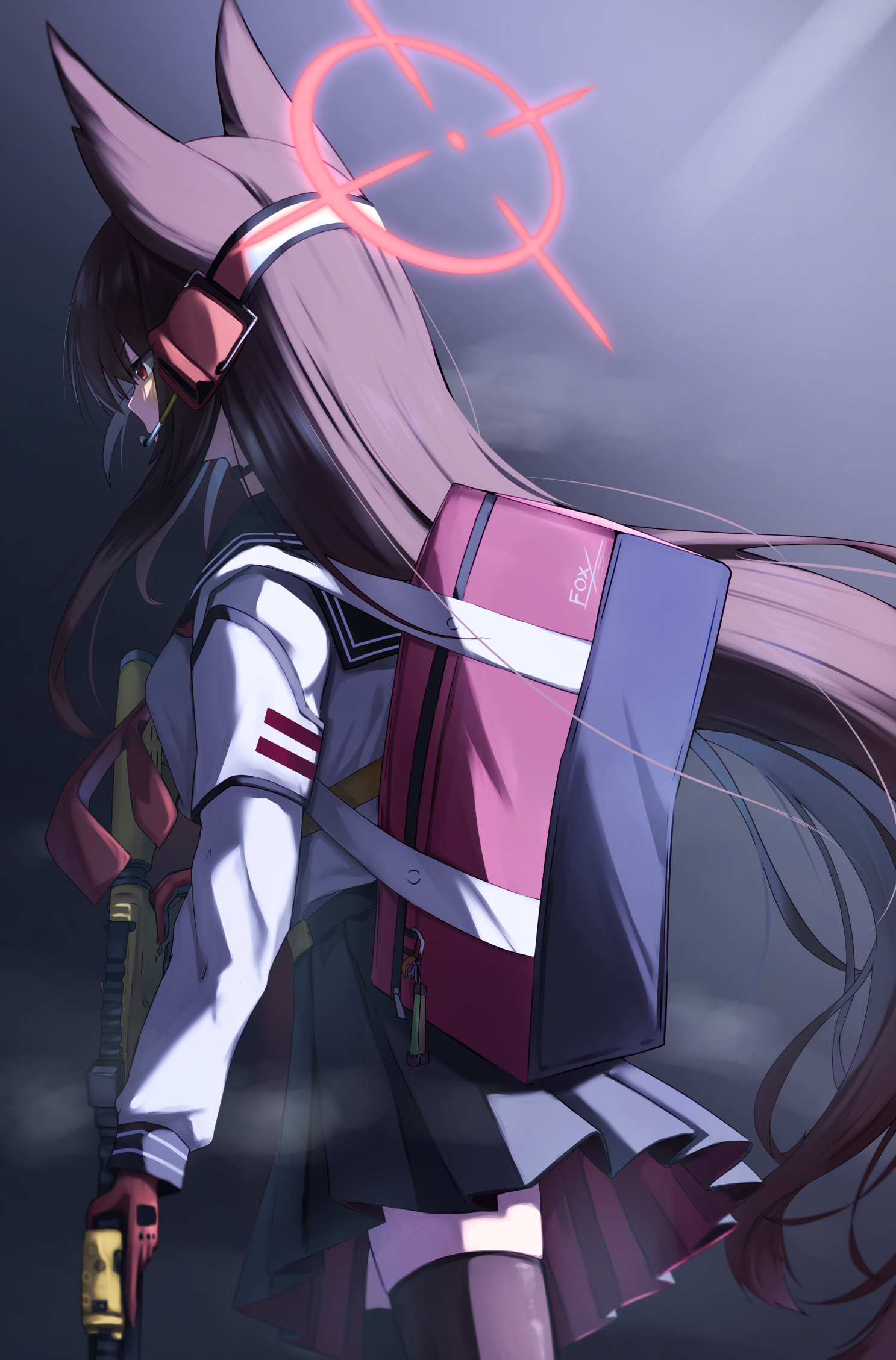 1girl aki_tsune animal_ears black_background black_skirt black_thighhighs blue_archive blue_sailor_collar brown_hair cowboy_shot facing_away fox_ears fox_girl from_behind gloves gun halo headphones headset highres holding holding_gun holding_weapon implied_extra_ears long_hair long_sleeves looking_at_viewer neckerchief pleated_skirt red_eyes red_gloves red_neckerchief sailor_collar school_uniform serafuku shirt sidelocks simple_background skirt solo thighhighs very_long_hair weapon white_shirt yukino_(blue_archive)