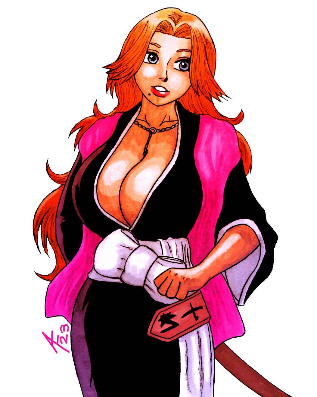 1girl aaronhibiki black_kimono bleach breasts cleavage haori highres huge_breasts japanese_clothes jewelry kimono large_breasts matsumoto_rangiku mole mole_under_mouth necklace orange_hair pink_shawl shawl xxxhibiki