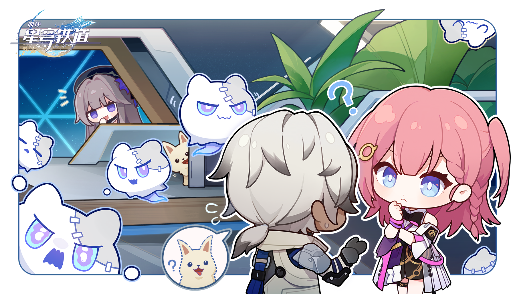 1boy 2girls ? animal arlan_(honkai:_star_rail) asta_(honkai:_star_rail) beret black_headwear blue_eyes braid brown_hair chibi chinese_commentary closed_mouth dark-skinned_male dark_skin dog hat herta_(honkai:_star_rail) herta_(puppet)_(honkai:_star_rail) highres honkai:_star_rail honkai_(series) indoors logo long_hair looking_at_another medium_hair multiple_girls official_art open_mouth peppy_(honkai:_star_rail) pink_hair side_ponytail space_station speech_bubble sweatdrop v-shaped_eyebrows white_hair wubbaboo_(honkai:_star_rail)