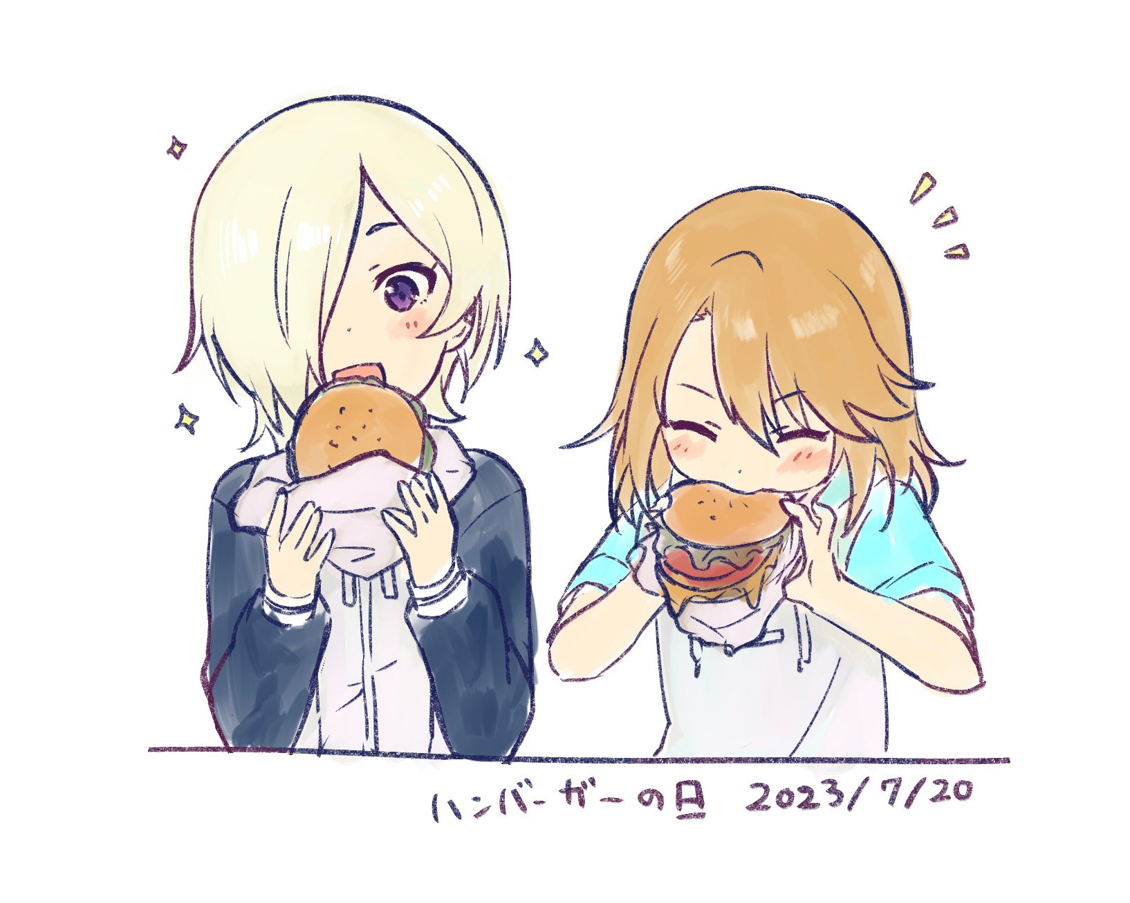 2girls amasaki333 black_jacket blonde_hair blue_sleeves blush burger closed_eyes commentary dot_nose drawstring eating food hair_between_eyes hair_over_one_eye hands_up highres holding holding_food idolmaster idolmaster_cinderella_girls jacket looking_at_another love_live! love_live!_nijigasaki_high_school_idol_club mia_taylor multiple_girls notice_lines open_mouth orange_hair shirt short_hair short_sleeves smile sparkle translated upper_body white_background white_shirt yuuki_haru