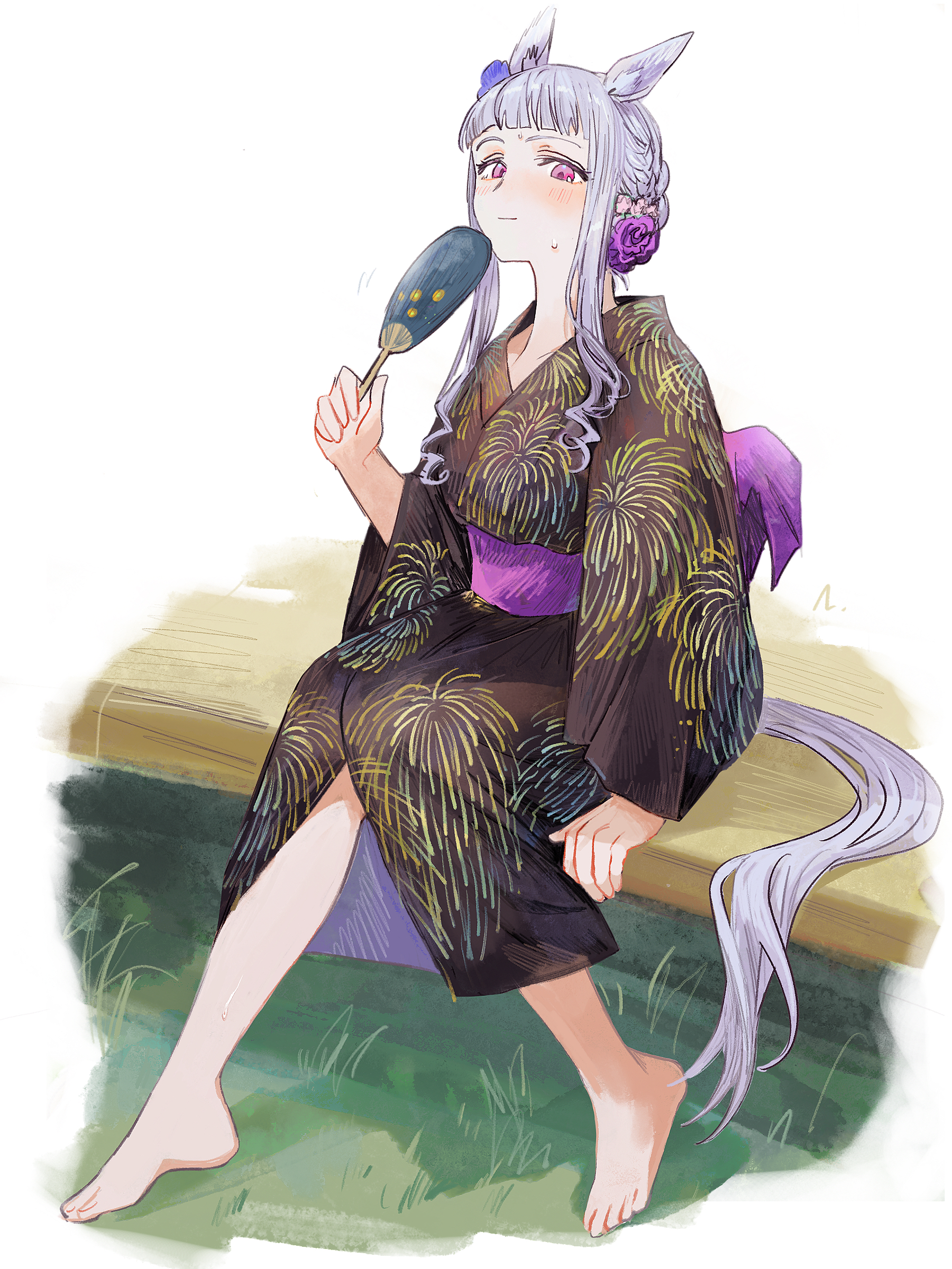1girl absurdres animal_ears barefoot feet gold_ship_(umamusume) hand_fan highres horse_ears horse_girl japanese_clothes kimono looking_at_viewer rosette_(roze-ko) sitting solo toes umamusume