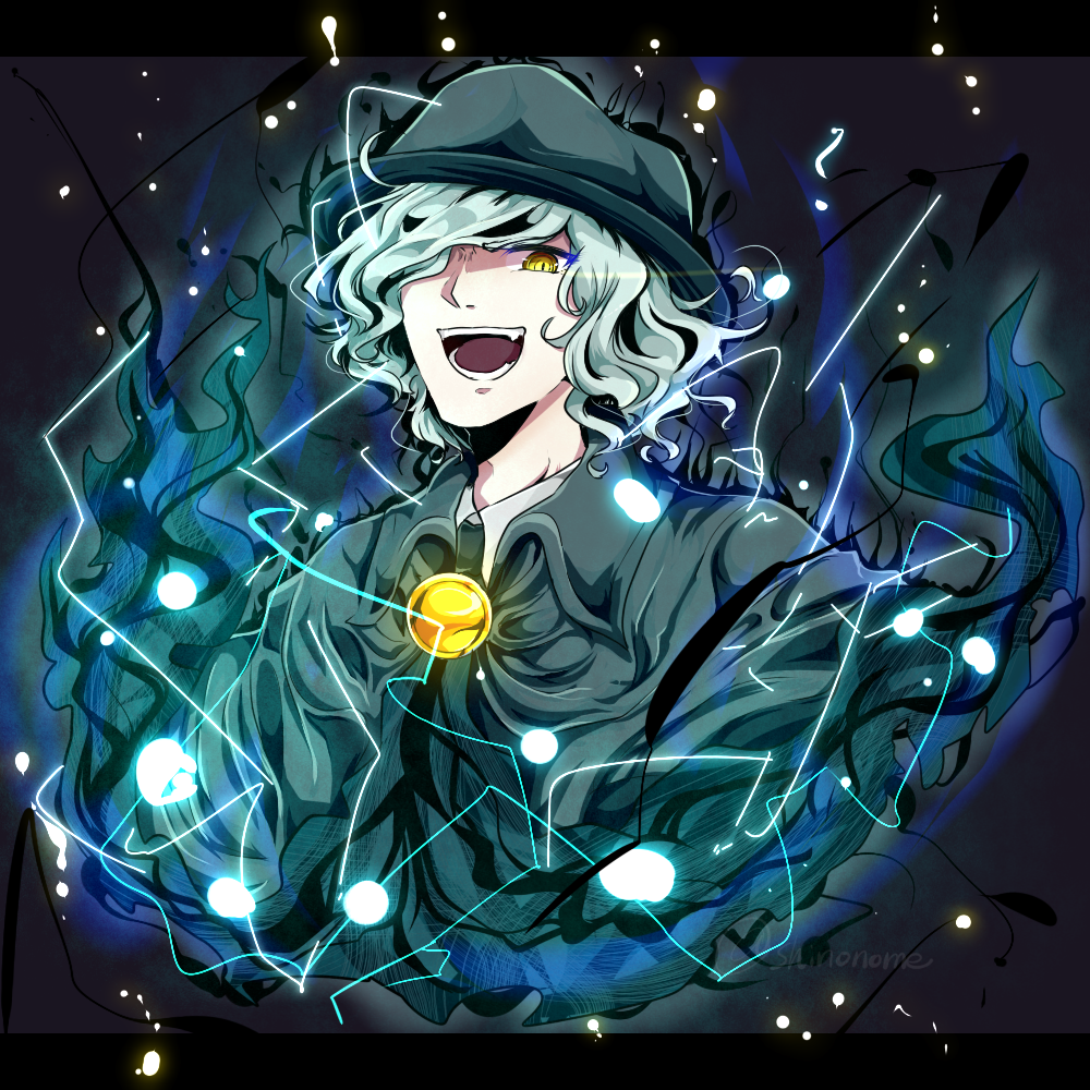 1boy cape collared_shirt colored_eyelashes edmond_dantes_(fate) electricity fate/grand_order fate_(series) fedora grey_background grey_cape grey_hair hair_over_one_eye hat jewelry letterboxed male_focus pendant shinonome_kia shirt short_hair signature solo teeth wavy_hair yellow_eyes
