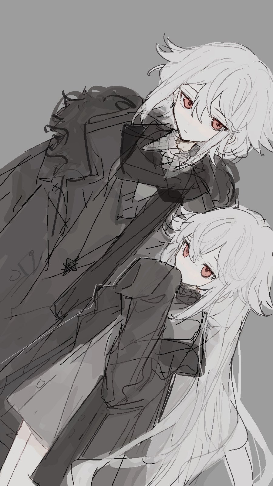 1boy 1girl black_coat black_jacket black_scarf black_sweater closed_mouth coat dress dutch_angle grey_background grey_dress hand_up highres jacket jewelry koirariko long_hair long_sleeves necklace original pink_eyes scarf sidelocks simple_background sleeves_past_fingers sleeves_past_wrists sweater very_long_hair white_hair