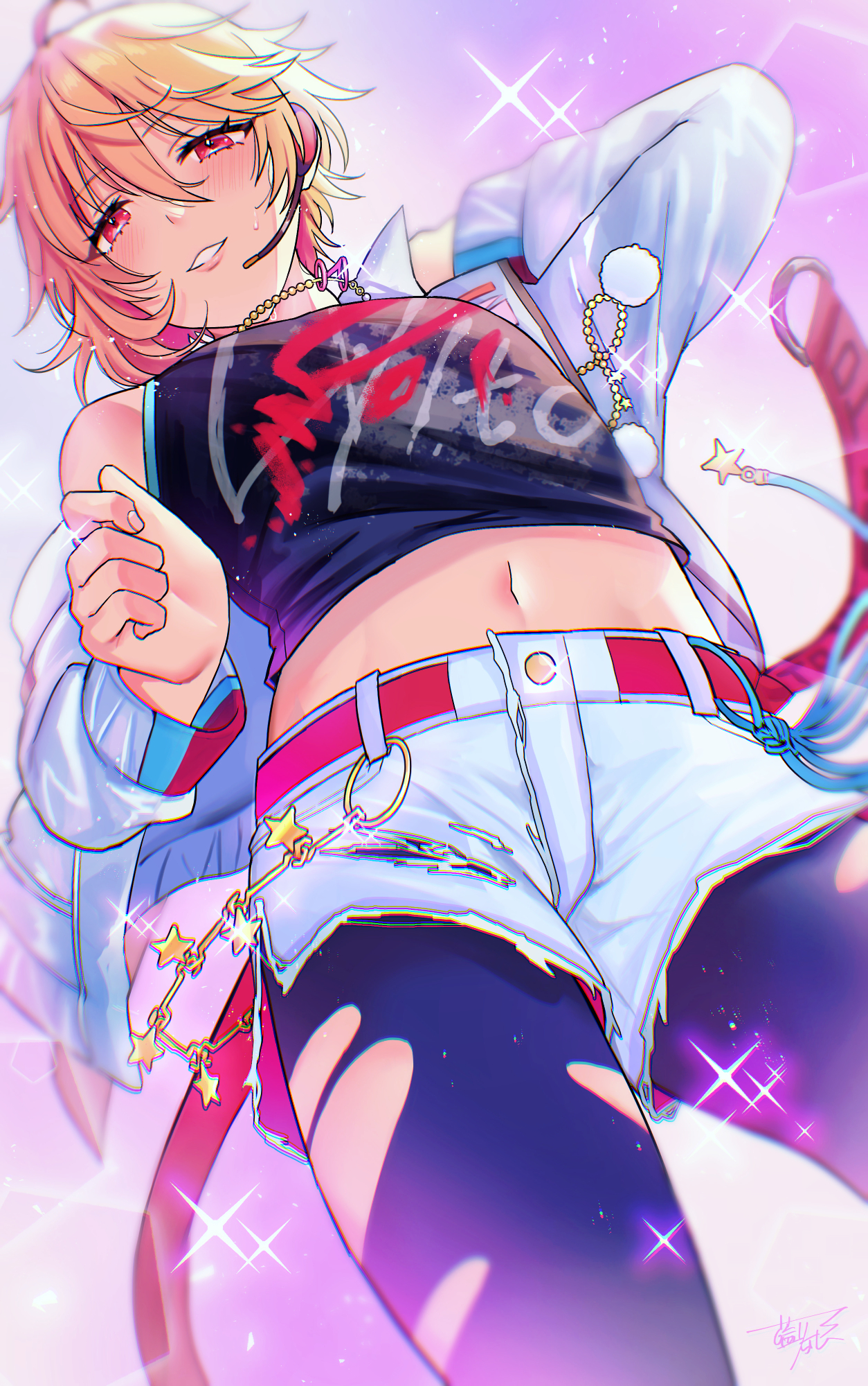 1boy ahoge aina123 arm_behind_head belt blonde_hair blush crop_top crossdressing crossdressing_(mtf) ensemble_stars! highres jacket looking_at_viewer looking_down microphone midriff navel nito_nazuna open_mouth pantyhose pantyhose_under_shorts red_belt red_eyes shorts signature solo sweat sweatdrop thighhighs torn_clothes torn_thighhighs trap white_jacket
