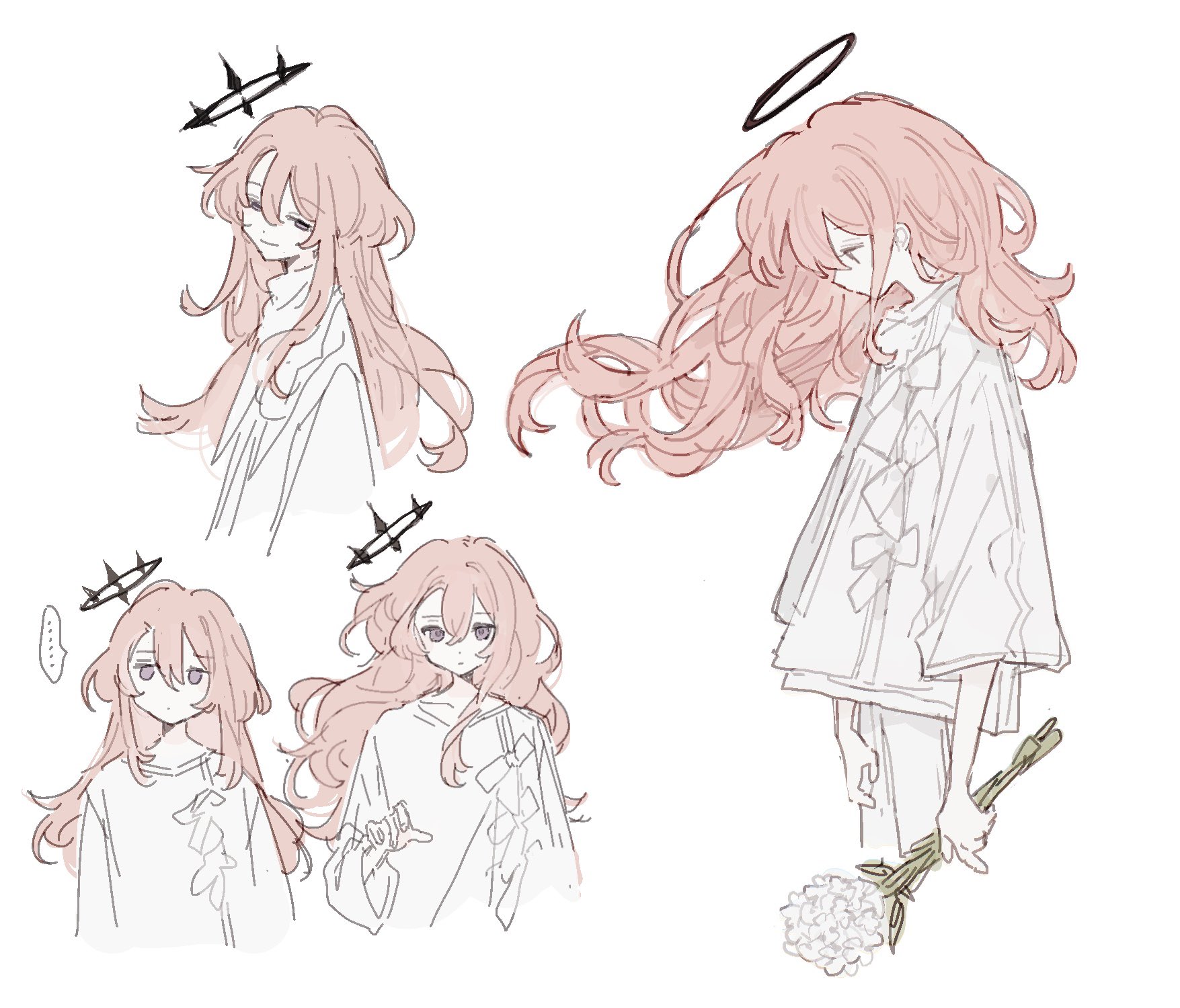 1girl closed_mouth dark_halo flower grey_eyes hair_between_eyes halo highres holding holding_flower koirariko long_hair long_sleeves looking_at_viewer multiple_views original pants pink_hair shirt sidelocks simple_background smile very_long_hair white_background white_flower white_pants white_shirt
