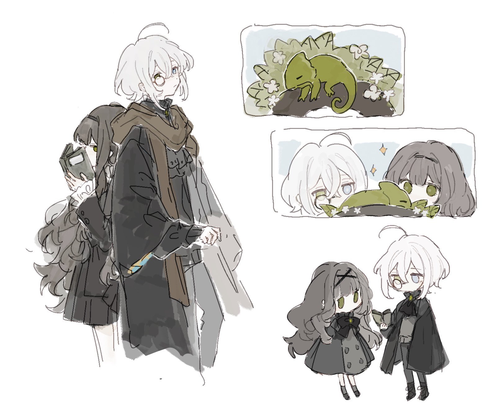 1boy 1girl ahoge ascot black_ascot black_bow black_bowtie black_cape black_coat black_hair black_hairband black_shirt blue_eyes book bow bowtie brown_eyes brown_scarf cape chameleon closed_mouth coat flower green_eyes hairband highres holding holding_book koirariko leaf long_hair monocle no_heterochromia original scarf shirt simple_background sparkle very_long_hair white_background white_flower white_hair