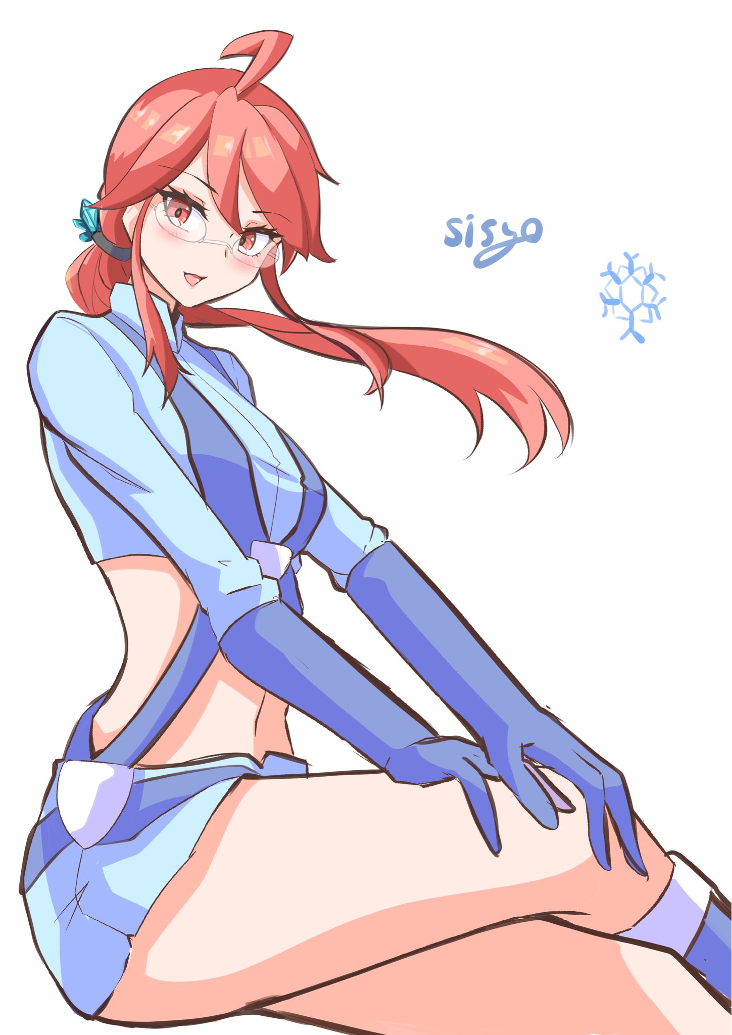 1girl blush cosplay crop_top glasses gloves highres long_hair long_sleeves lorelei_(pokemon) nintendo pokemon pokemon_black_and_white pokemon:_let's_go_pikachu!_and_let's_go_eevee! ponytail red_eyes red_hair shorts sisyo_x sitting skyla_(pokemon) skyla_(pokemon)_(cosplay)