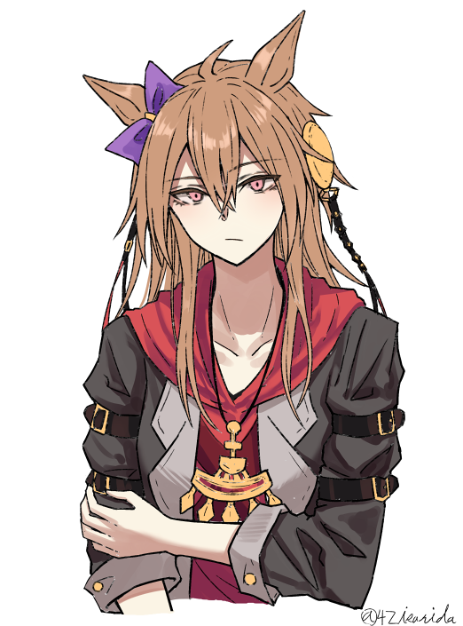 1girl animal_ears black_jacket bow brown_eyes brown_hair closed_mouth cropped_torso ear_bow expressionless hair_between_eyes hand_on_own_arm hood hood_down hoodie horse_ears isarida jacket jewelry long_hair long_sleeves looking_at_viewer necklace open_clothes open_jacket orfevre_(old_design)_(umamusume) red_hoodie simple_background solo twitter_username umamusume upper_body white_background