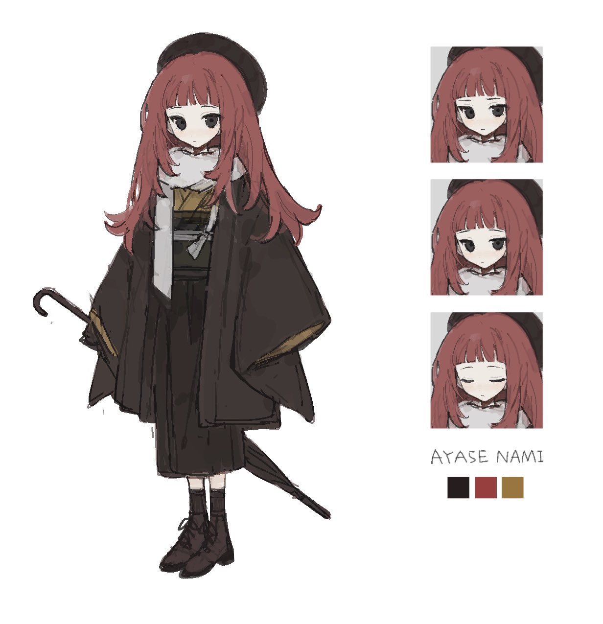1girl beret black_hat black_socks boots brown_boots brown_eyes brown_jacket brown_kimono brown_sash closed_mouth haori hat highres holding holding_umbrella jacket japanese_clothes kimono koirariko long_hair looking_at_viewer multiple_expressions obi original pink_hair sash sidelocks simple_background socks solo taishou umbrella very_long_hair white_background wide_sleeves