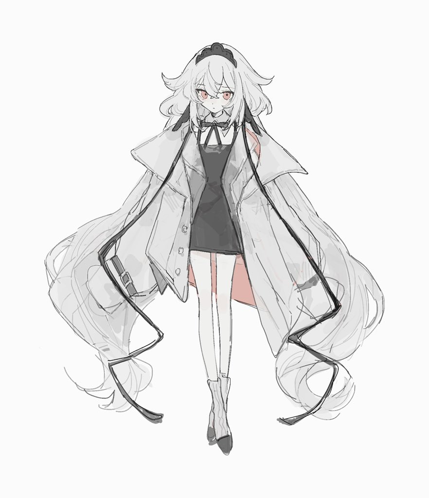 1girl black_dress black_ribbon boots closed_mouth collared_shirt dress hair_flaps head_wings jacket koirariko long_hair long_sleeves neck_ribbon original pink_eyes ribbon shirt sidelocks simple_background sleeves_past_fingers sleeves_past_wrists solo tiara very_long_hair white_background white_boots white_hair white_jacket white_shirt wings