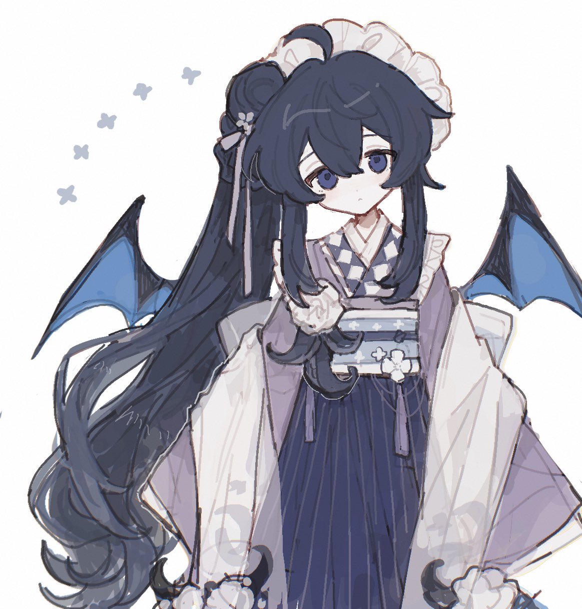 1girl ahoge bat_wings blue_eyes blue_hair blue_sash closed_mouth cowboy_shot flower hair_bun highres japanese_clothes kimono koirariko looking_at_viewer maid maid_headdress obi obiage obijime original purple_kimono sash side_ponytail sidelocks simple_background solo wa_maid white_background white_flower wings