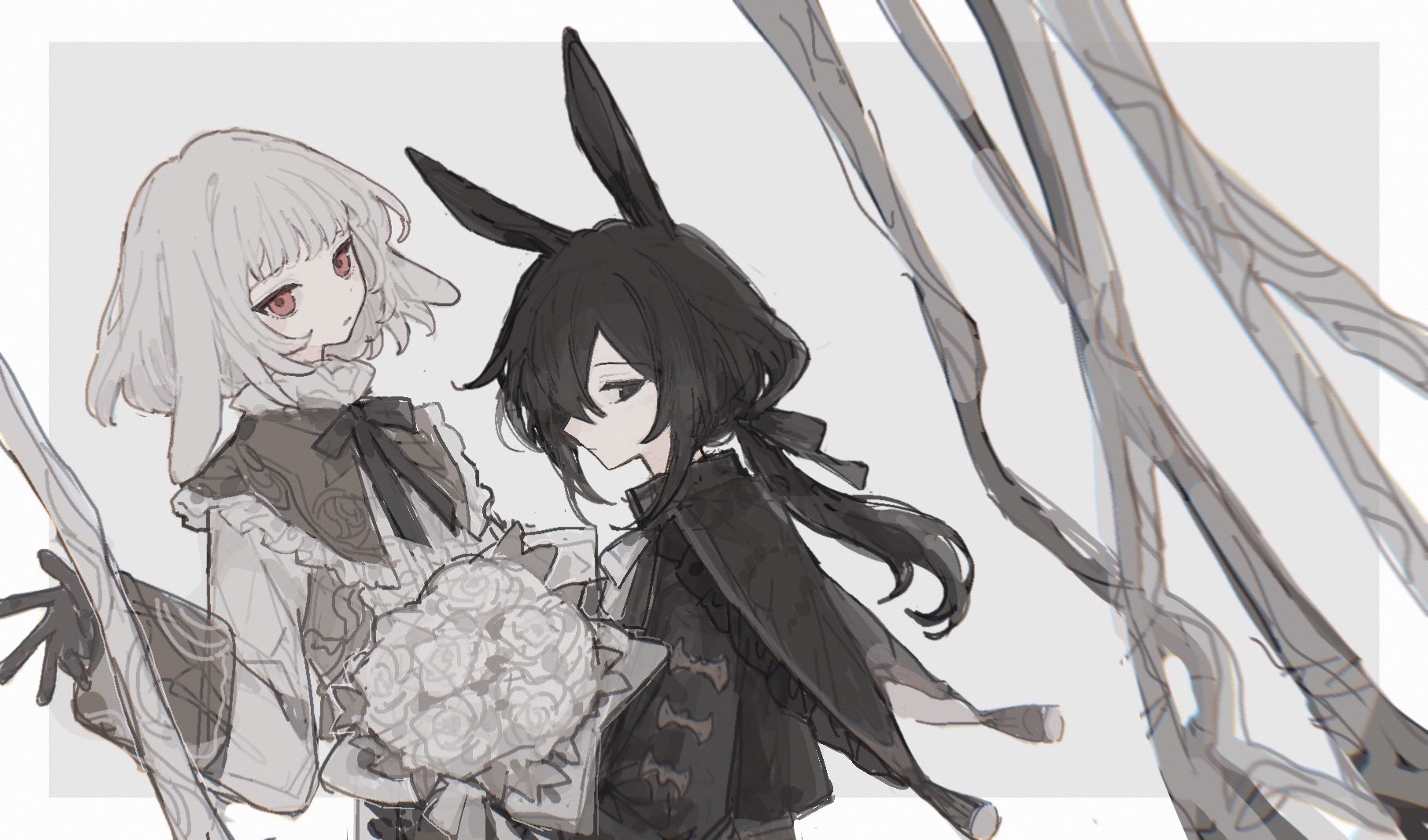 2boys animal_ears black_eyes black_gloves black_hair black_jacket black_ribbon bouquet flower gloves hair_ribbon highres holding holding_bouquet jacket koirariko long_hair long_sleeves looking_at_viewer low_ponytail multiple_boys neck_ribbon original pink_eyes ponytail rabbit_ears ribbon sidelocks simple_background upper_body white_hair white_jacket