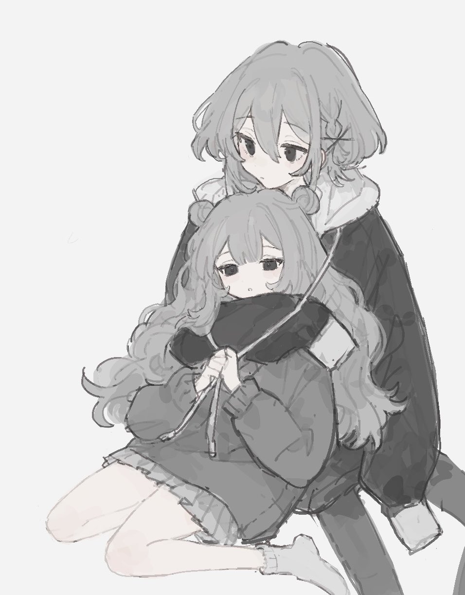 1boy 1girl braid closed_mouth double_bun drawstring grey_eyes grey_hair grey_jacket grey_pants grey_skirt grey_sweater hair_bun highres hood hood_down hooded_jacket jacket koirariko original pants parted_lips pleated_skirt sidelocks simple_background sitting skirt socks sweater wariza white_background white_socks