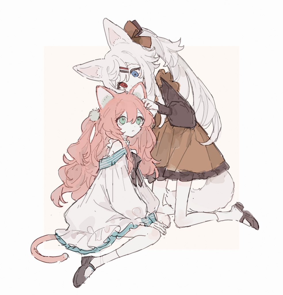 2girls animal_ears aqua_eyes black_dress black_footwear blue_eyes bow brown_bow brown_dress dress fox_ears fox_tail frilled_dress frills hair_bow hair_ornament hairclip heterochromia high_ponytail koirariko long_hair long_sleeves looking_at_another mary_janes multiple_girls original pom_pom_(clothes) pom_pom_hair_ornament ponytail puffy_long_sleeves puffy_sleeves red_eyes shoes simple_background socks tail two_side_up very_long_hair white_background white_dress white_hair white_socks