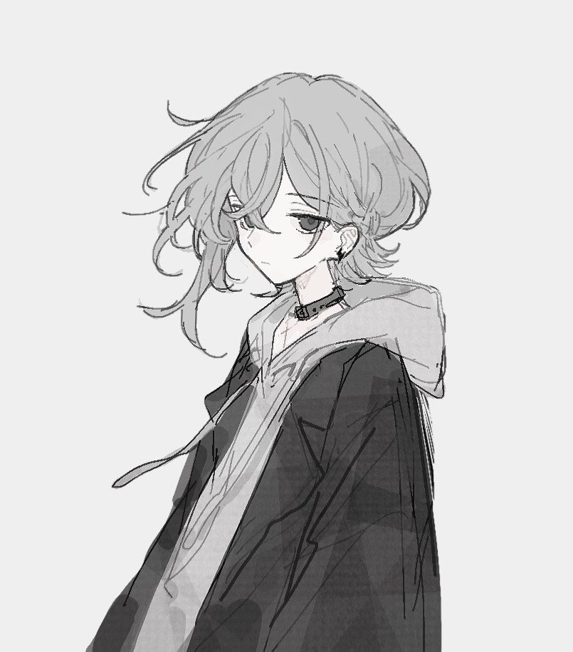 1boy black_choker black_jacket braid choker drawstring grey_eyes grey_hair grey_hoodie hood hood_down hoodie jacket koirariko long_sleeves looking_at_viewer male_focus original sidelocks simple_background solo wing_collar