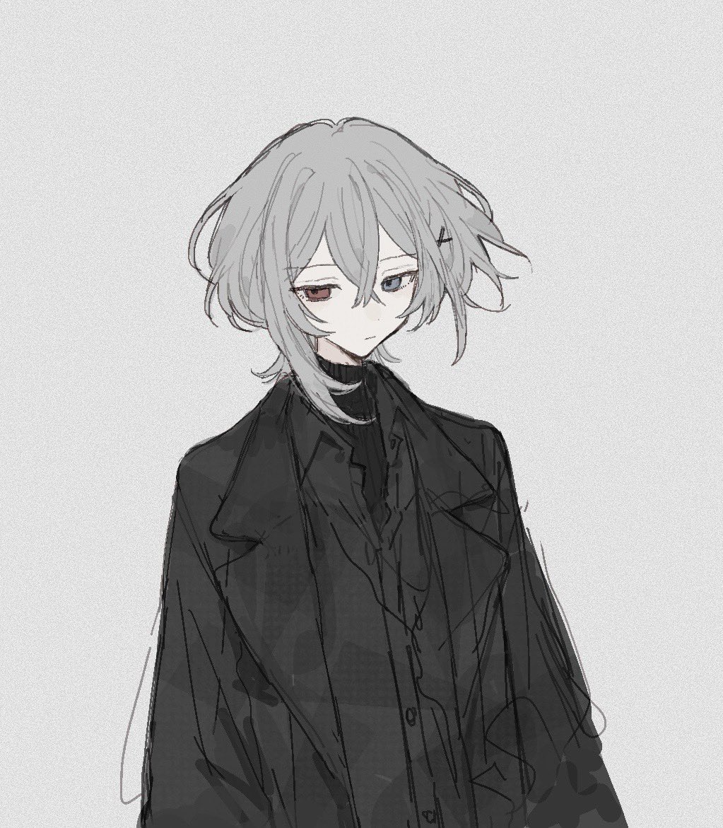 1boy black_jacket black_shirt black_sweater blue_eyes closed_mouth crossed_bangs grey_background grey_hair heterochromia jacket koirariko long_sleeves looking_at_viewer original red_eyes shirt sidelocks simple_background solo sweater upper_body wing_collar