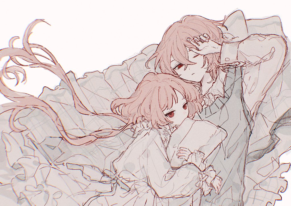 1boy 1girl blue_sweater_vest closed_mouth collared_shirt dress frilled_sleeves frills hand_up koirariko long_hair long_sleeves low_twintails hugging_object original pillow pillow_hug pink_hair puffy_long_sleeves puffy_sleeves red_eyes ribbon shirt simple_background sweater_vest twintails very_long_hair white_background white_dress white_ribbon white_shirt
