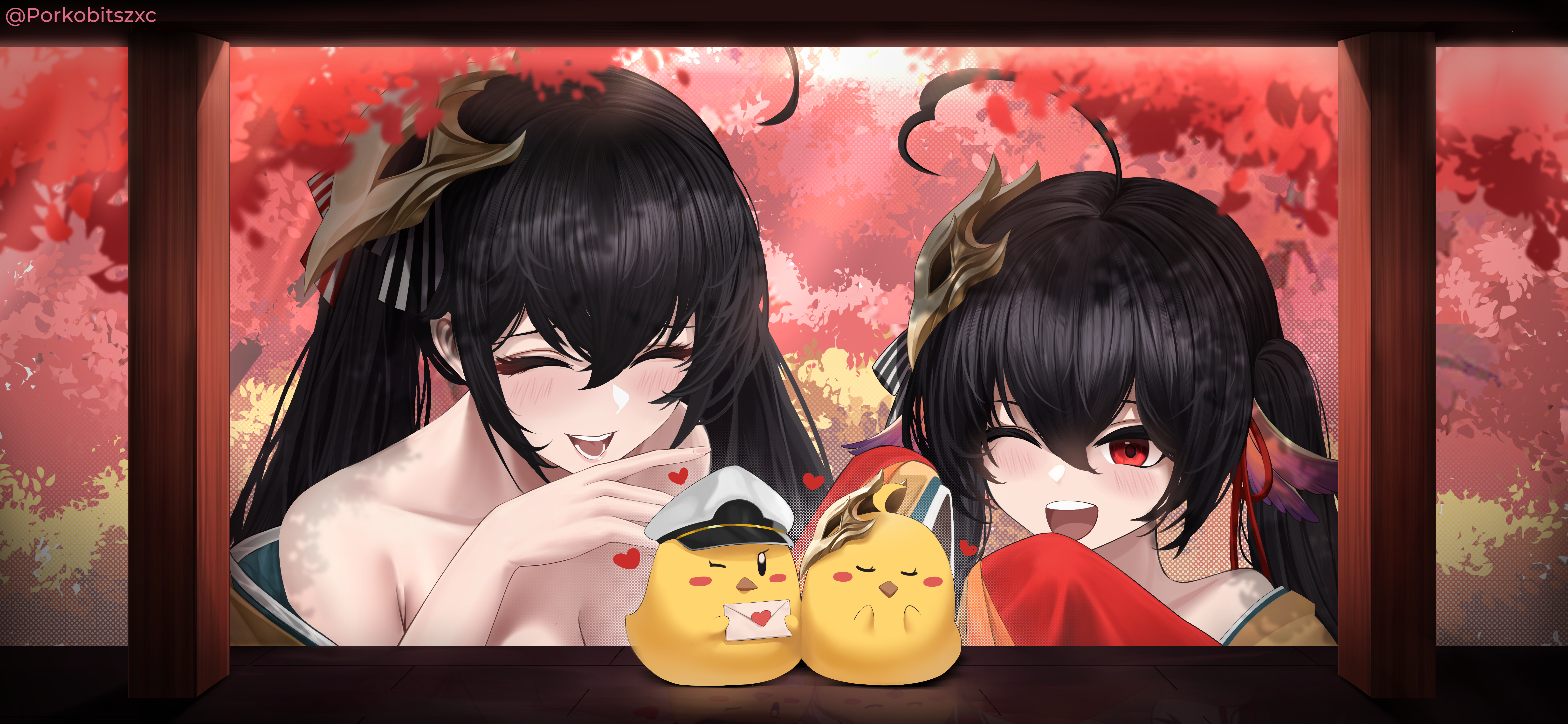 2girls absurdres age_difference ahoge autumn_leaves azur_lane black_hair blush blush_stickers breasts cleavage collarbone commander_(azur_lane) forest hair_between_eyes happy hat heart highres large_breasts laughing leaf letter manjuu_(azur_lane) multiple_girls nature off_shoulder porko red_eyes smile taihou-chan_(azur_lane) taihou_(azur_lane) twintails