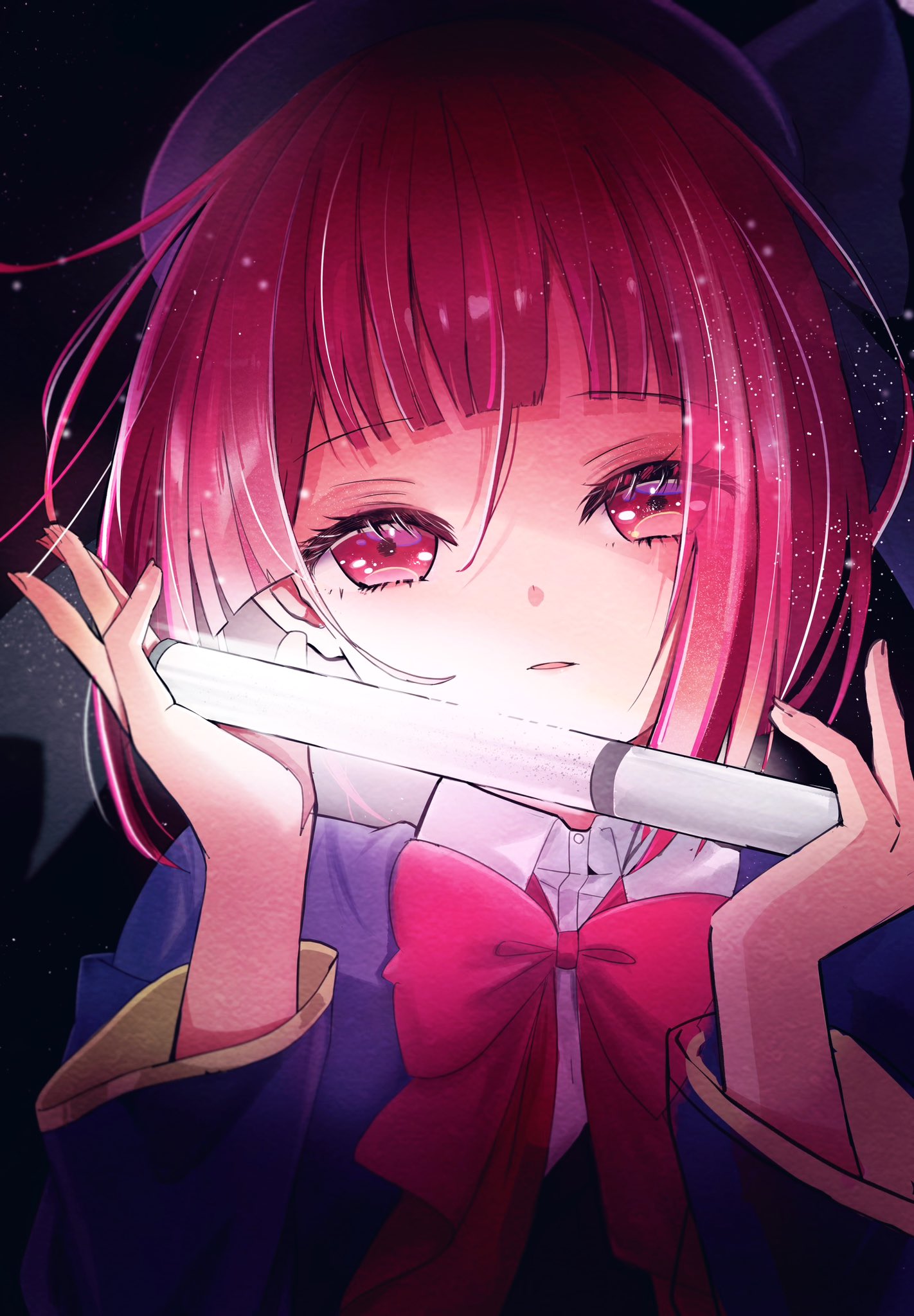 1girl arima_kana black_background blue_headwear blue_jacket glowstick hat highres jacket looking_at_viewer masaki_(ngngwasshoi) oshi_no_ko penlight_(glowstick) pink_ribbon red_eyes red_hair ribbon school_uniform unhappy youtou_high_school_uniform