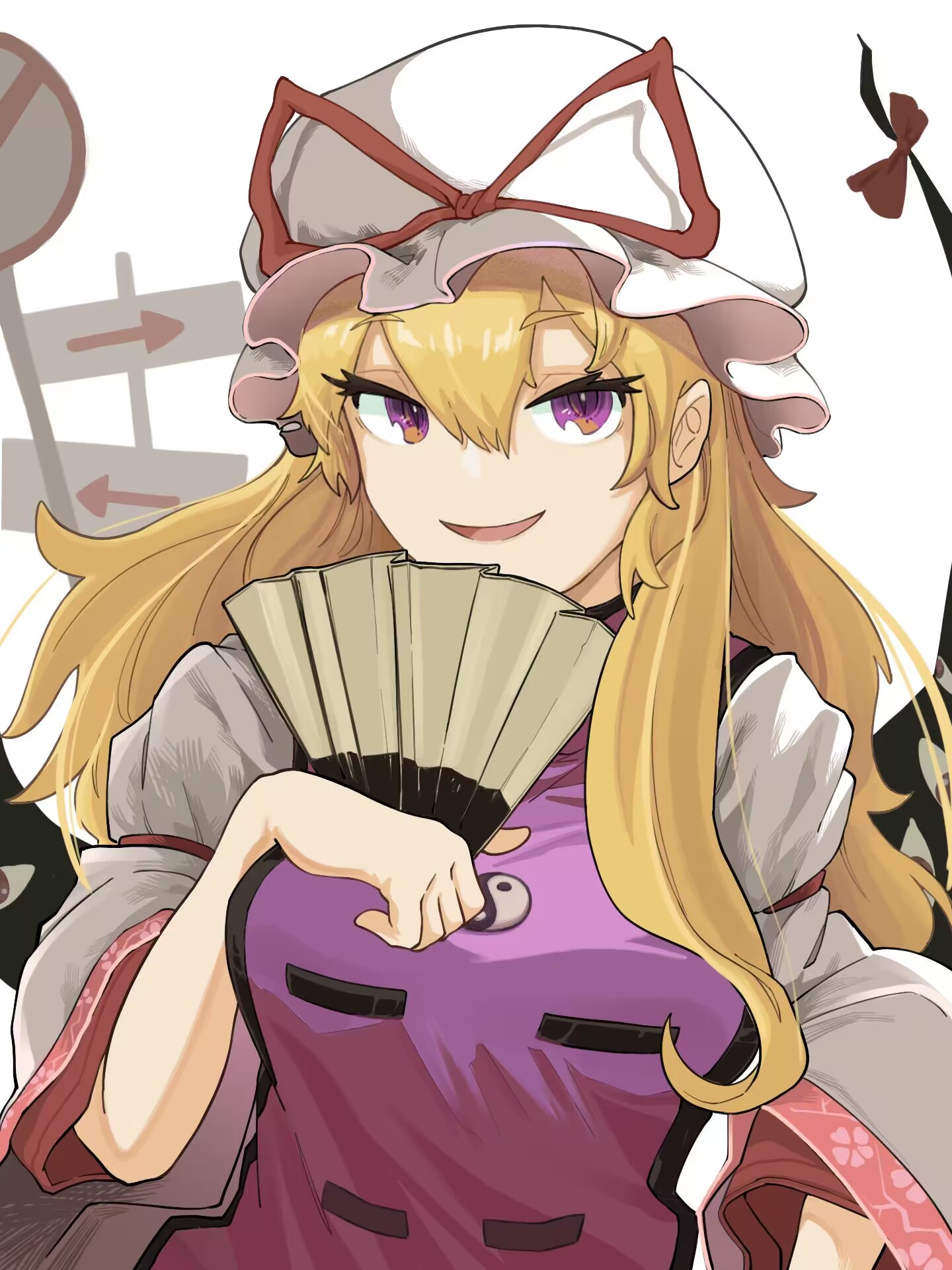 1girl blonde_hair breasts commentary eyelashes gap_(touhou) hair_between_eyes hand_fan hat hat_ribbon highres holding holding_fan large_breasts long_hair long_sleeves looking_at_viewer mob_cap onionmay open_mouth purple_eyes red_ribbon ribbon road_sign sidelocks sign signpost smile solo tabard touhou trigram white_hat wide_sleeves yakumo_yukari yin_yang yin_yang_print