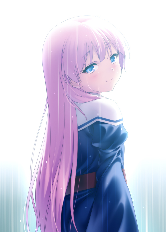 1girl black_dress blue_eyes blush closed_mouth commentary_request cowboy_shot dress eyelashes hair_between_eyes hair_over_shoulder head_tilt juliet_sleeves kamisama_ni_natta_hi long_hair long_sleeves looking_at_viewer looking_back nun pink_hair puffy_sleeves rain sad_smile satou_hina_(kamisama_ni_natta_hi) simple_background solo standing straight_hair very_long_hair water_drop white_background zen_(kamuro)