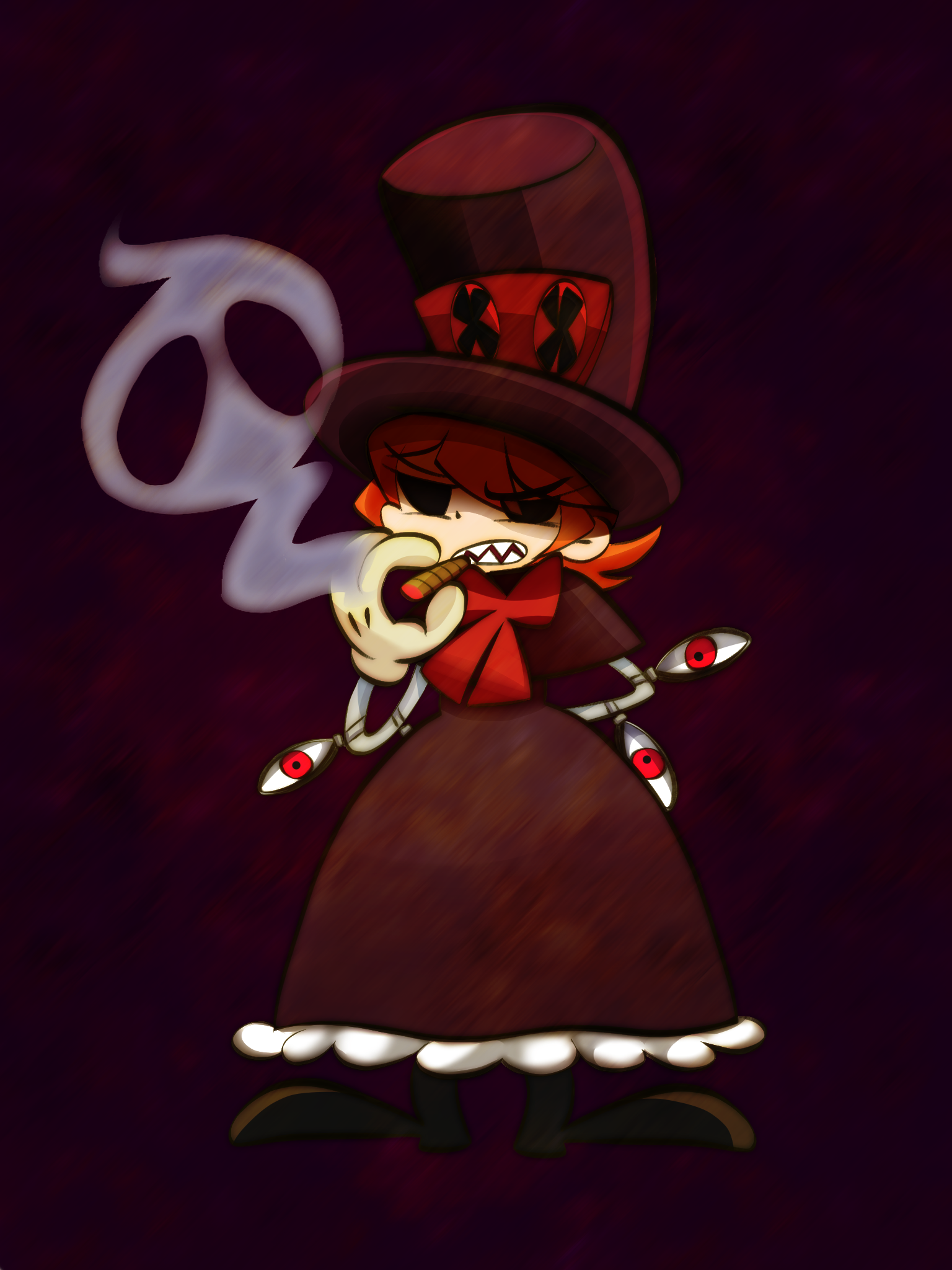 1girl black_background black_dress black_hat bow brainfantasy cigar dress full_body gloves hat highres ibispaint_(medium) mechanical_arms mouth_hold orange_hair peacock_(skullgirls) red_bow sharp_teeth short_hair skullgirls smoking solo teeth teeth_hold toon_(style) top_hat white_gloves
