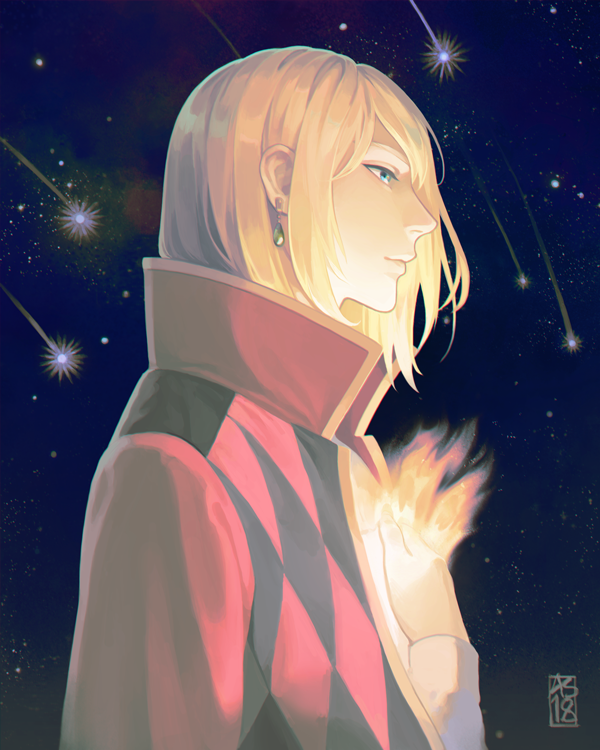 1boy blonde_hair blue_eyes collar driftwoodwolf earrings fire hand_on_own_chest howl_no_ugoku_shiro howl_(howl_no_ugoku_shiro) jacket jewelry magic male_focus open_clothes open_jacket shooting_star sky solo star_(sky) starry_sky studio_ghibli upper_body wrist_cuffs