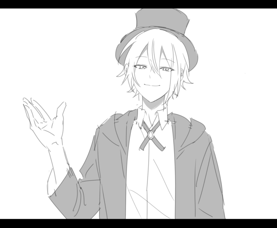 1boy closed_mouth collared_shirt commentary cross_tie double-parted_bangs hand_up hat hk_(wgyz7222) kamishiro_rui letterboxed long_sleeves looking_at_viewer male_focus monochrome multicolored_hair project_sekai shirt short_hair smile solo streaked_hair top_hat two-tone_hair upper_body white_background