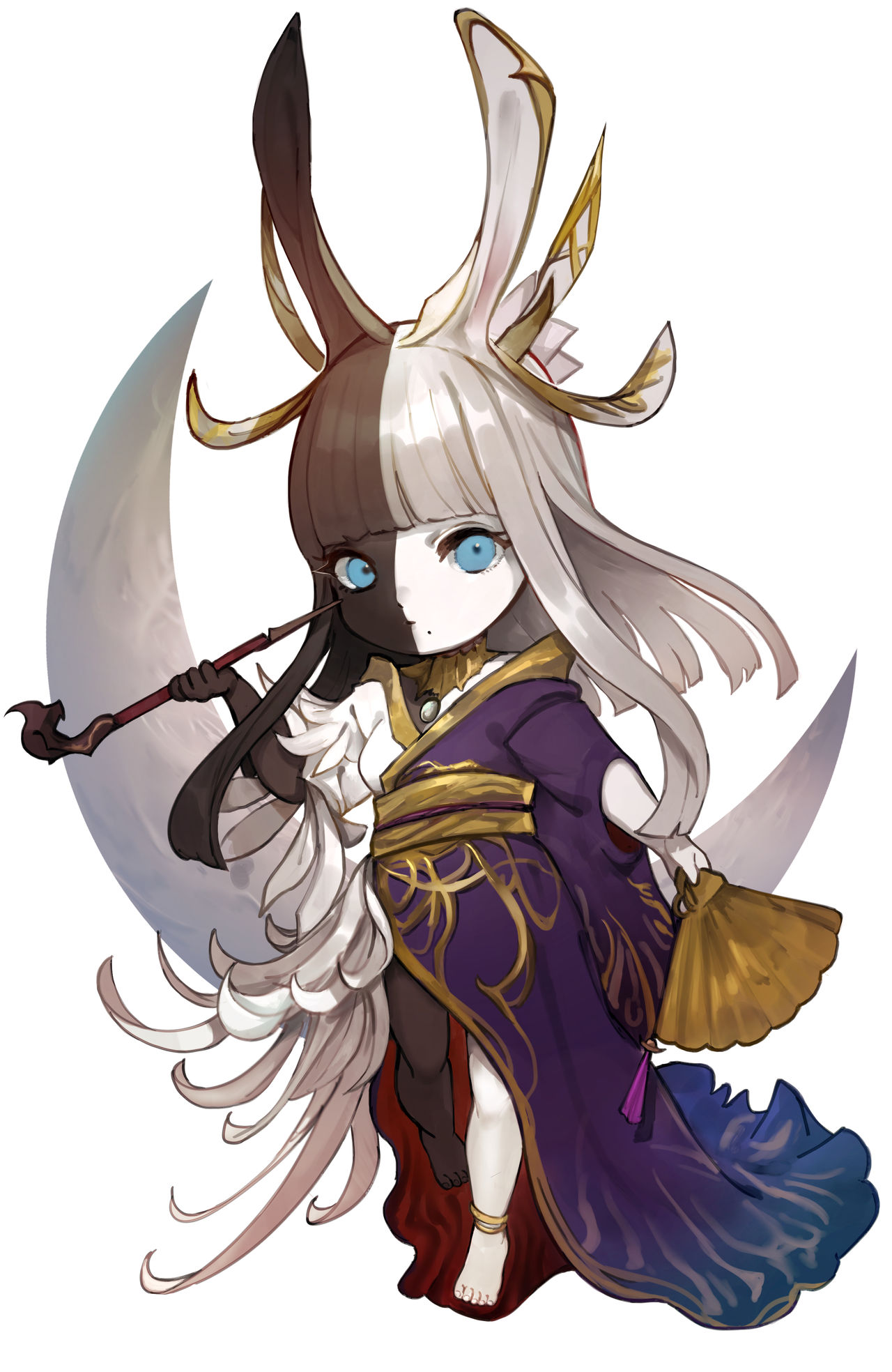 1girl animal_ears anklet bad_id bad_pixiv_id barefoot black_hair black_skin blue_eyes blunt_bangs blunt_ends chibi colored_skin crescent_moon final_fantasy final_fantasy_xiv floating floating_hair folding_fan full_body hand_fan headpiece highres holding holding_fan holding_smoking_pipe japanese_clothes jewelry kimono kiseru kuroge_(kewagyuu) looking_at_viewer mole mole_under_mouth moon multicolored_hair multicolored_skin obi obijime purple_kimono rabbit_ears sash sidelocks simple_background smoking_pipe solo split-color_hair split_theme straight_hair tassel tsukuyomi_(ff14) two-tone_hair two-tone_skin white_background white_hair white_skin yellow_collar