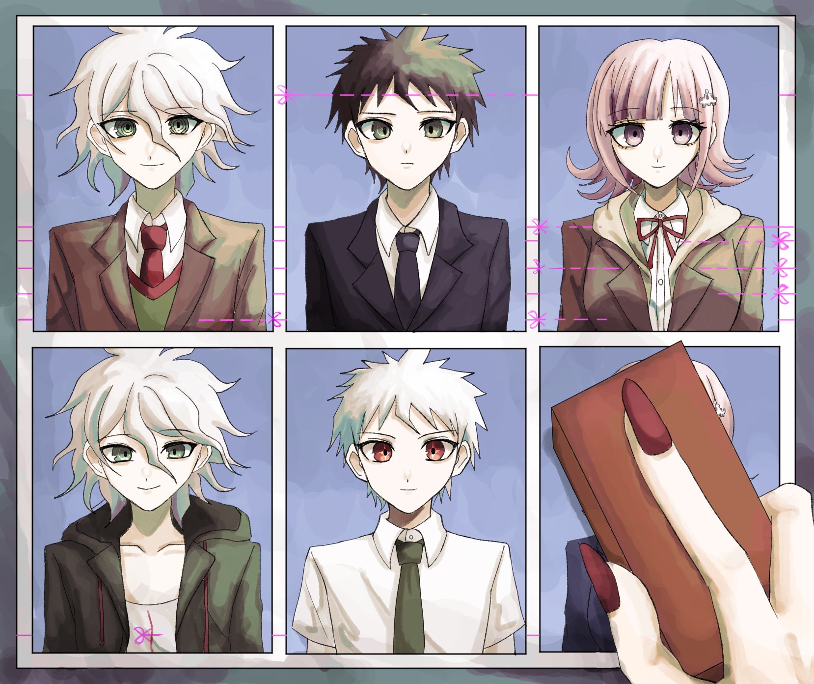 1girl black_necktie border brown_eyes brown_jacket collared_shirt danganronpa_(series) danganronpa_2:_goodbye_despair danganronpa_3_(anime) flipped_hair green_vest grey_border grey_hair hair_between_eyes hair_ornament highres hinata_hajime hinata_hajime_(awakened) holding hood hood_down hooded_jacket jacket komaeda_nagito medium_hair messy_hair nail_polish nanami_chiaki neck_ribbon necktie open_clothes open_jacket photo_(object) red_eyes red_nails red_necktie red_ribbon red_vest ribbon shirt shita_matsuge upper_body vest