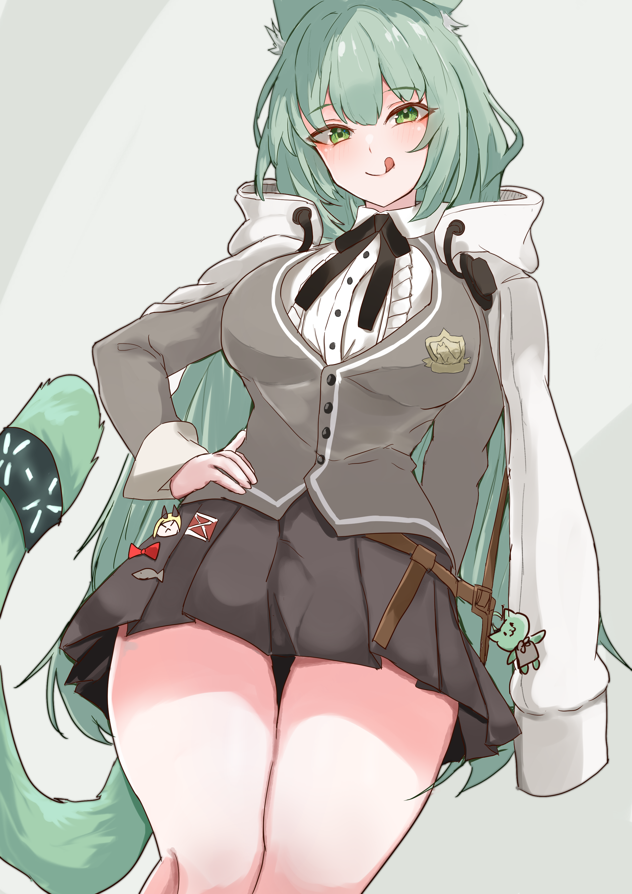 1girl absurdres animal_ears arknights breasts cardigan cat_ears cat_tail green_eyes green_hair grey_cardigan hand_on_own_hip harmonie_(arknights) highres large_breasts lemon_(citrono_lemon) licking_lips long_hair pleated_skirt skirt tail tongue tongue_out