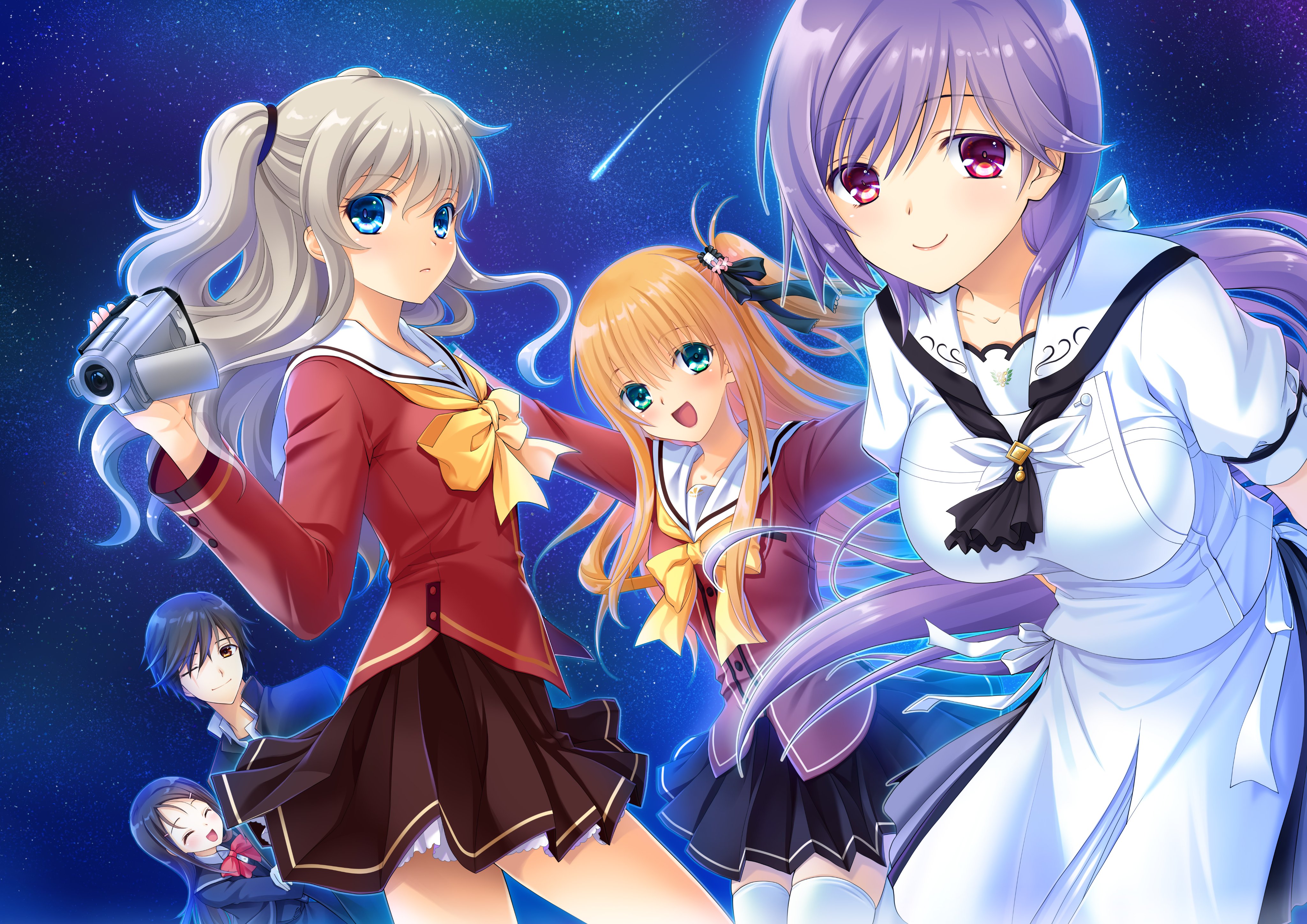 1boy 4girls :d absurdres black_skirt blonde_hair blue_eyes breasts brown_skirt camcorder charlotte_(anime) commentary company_connection crossover dress english_commentary grey_hair hamada_mari hand_up highres hoshinoumi_academy_school_uniform key_(company) large_breasts leaning_forward long_hair long_sleeves looking_at_viewer low_ponytail miniskirt mizuori_shizuku multiple_girls nishimori_yusa one_eye_closed one_side_up open_mouth otosaka_ayumi otosaka_yuu pleated_dress pleated_skirt ponytail purple_hair red_eyes red_shirt sailor_collar scar scar_across_eye scar_on_face school_uniform serafuku shirt shooting_star sidelocks skirt sky smile star_(sky) starry_sky summer_pockets thighhighs tomori_nao two_side_up very_long_hair video_camera wavy_hair white_sailor_collar white_serafuku white_shirt white_thighhighs zettai_ryouiki