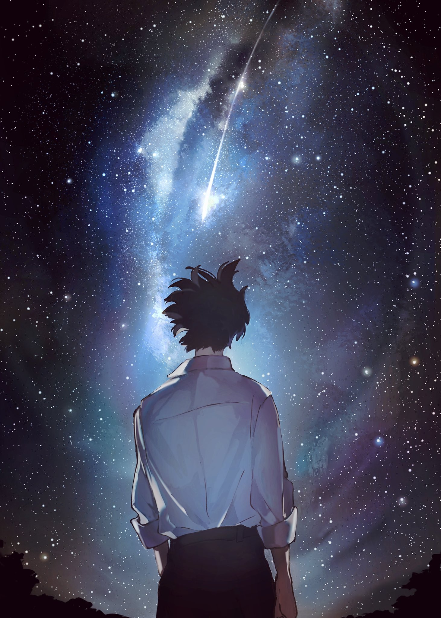 1boy black_hair black_pants falling_star highres looking_up milky_way night original outdoors pants shirt short_hair short_sleeves sky sky_focus solo standing star_(sky) starry_sky upper_body white_shirt yuribou
