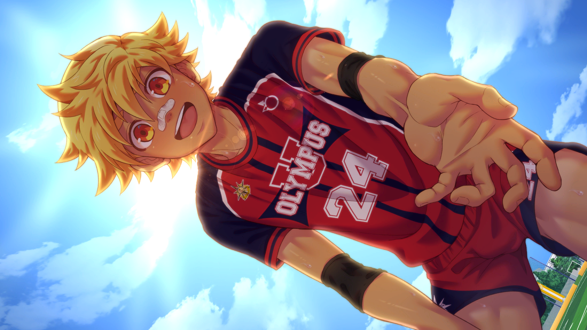 1boy armband artist_collaboration bandaid bandaid_on_face bandaid_on_nose black_armband blonde_hair blue_sky cloud dutch_angle highres jock_studio_(blits_games) leo_mendez_(jock_studio) looking_at_viewer male_focus mikkoukun non-web_source official_art open_mouth orange_eyes outdoors reaching reaching_towards_viewer red_shirt red_shorts shade shirt short_hair short_sleeves shorts sky solo teeth tongue upper_teeth_only variant_set zamius