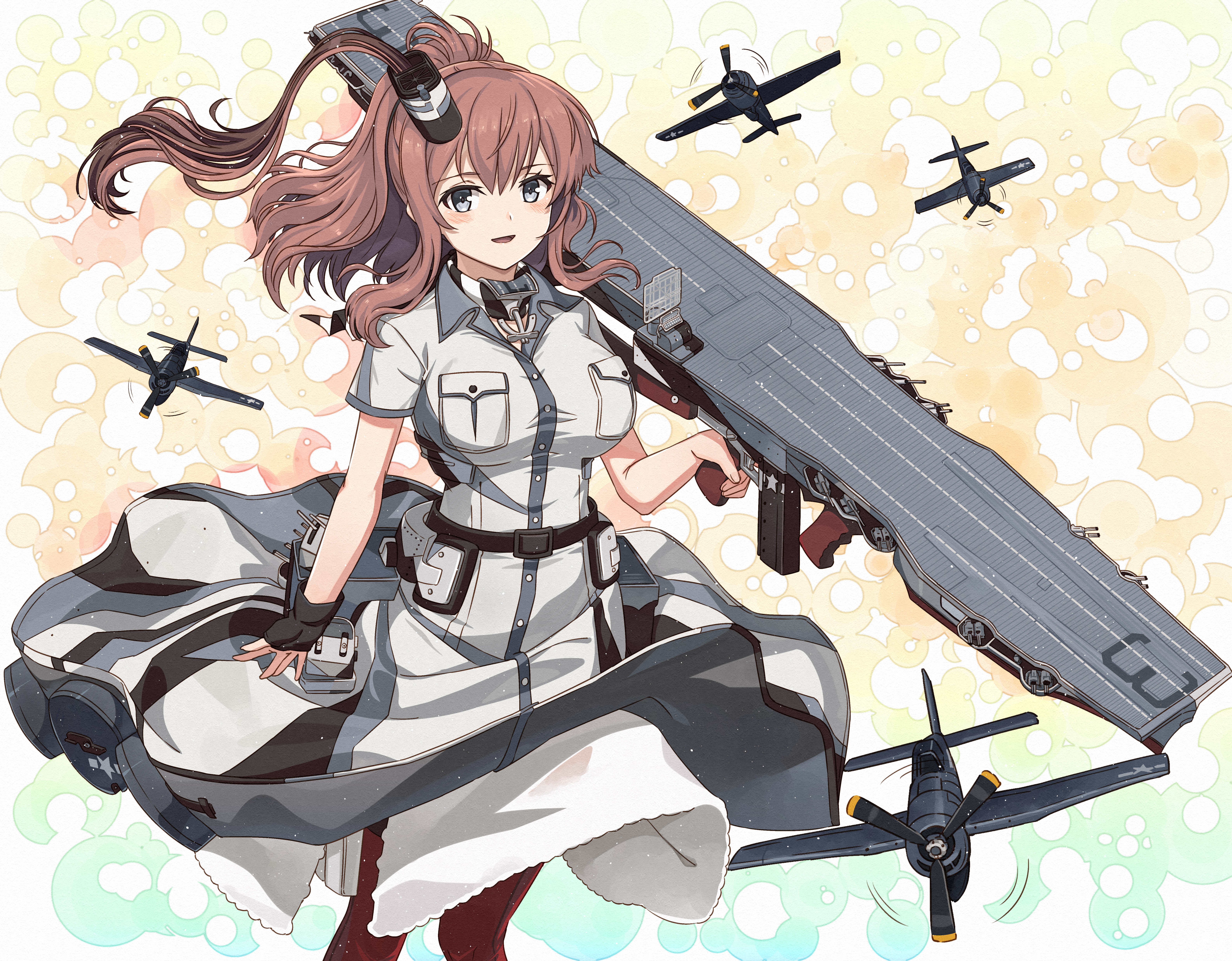 1girl absurdres aircraft black_gloves blush breast_pocket breasts brown_hair commentary_request commission fingerless_gloves flight_deck gloves grey_eyes hair_ornament high_side_ponytail highres holding kanmiya_shinobu kantai_collection large_breasts long_hair looking_at_viewer open_mouth pocket ponytail red_thighhighs saratoga_(kancolle) saratoga_mk_ii_(kancolle) short_sleeves side_ponytail simple_background single_glove skeb_commission smokestack_hair_ornament solo thighhighs