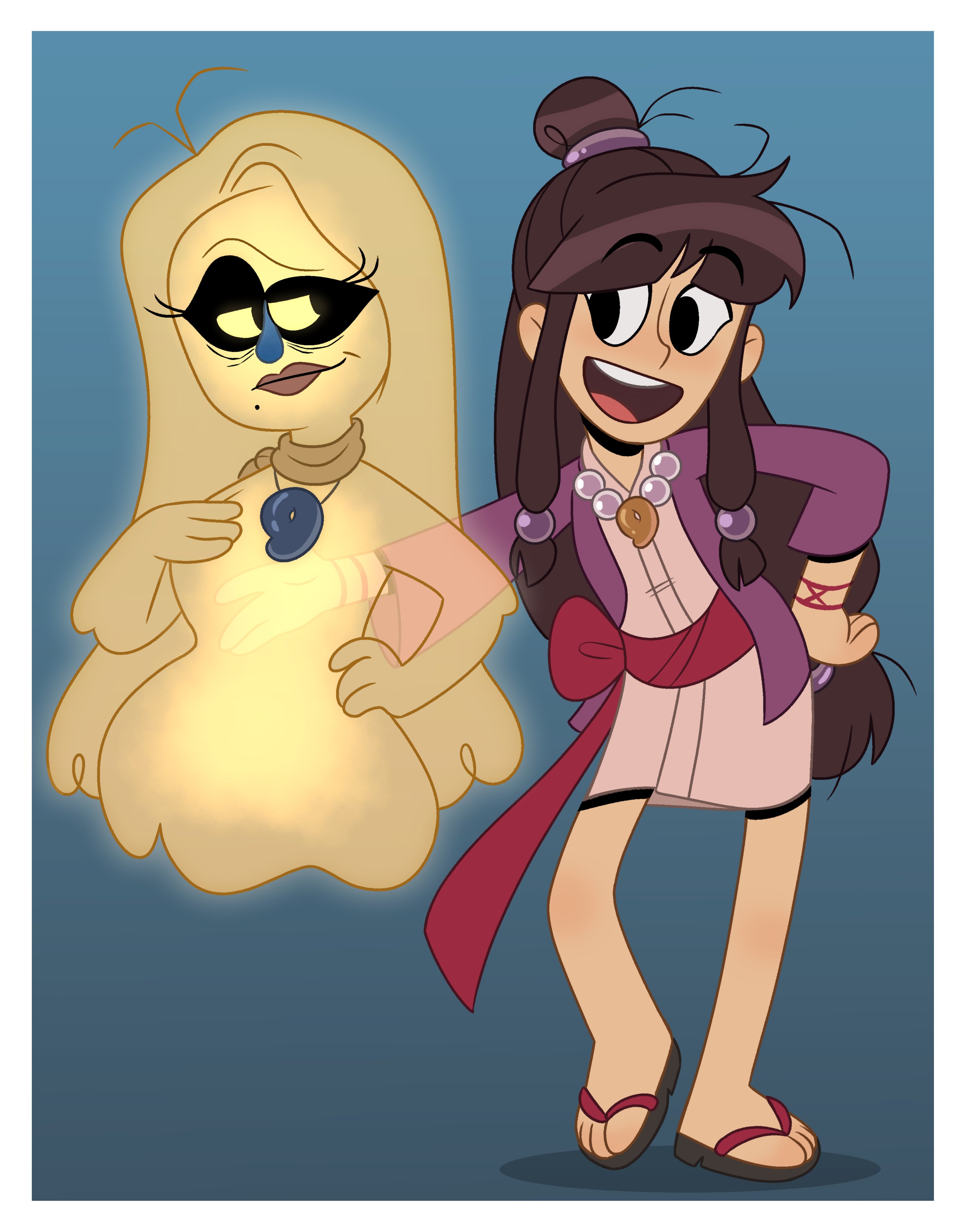 2girls absurdres ace_attorney blue_background creator_connection full_body ghost hair_ornament half_updo hanten_(clothes) highres japanese_clothes jewelry kimono long_hair magatama maya_fey mia_fey multiple_girls necklace official_style paula_peroff pink_sash red_sash sash short_kimono siblings simple_background sisters smile sphere_hair_ornament the_ghost_and_molly_mcgee topknot
