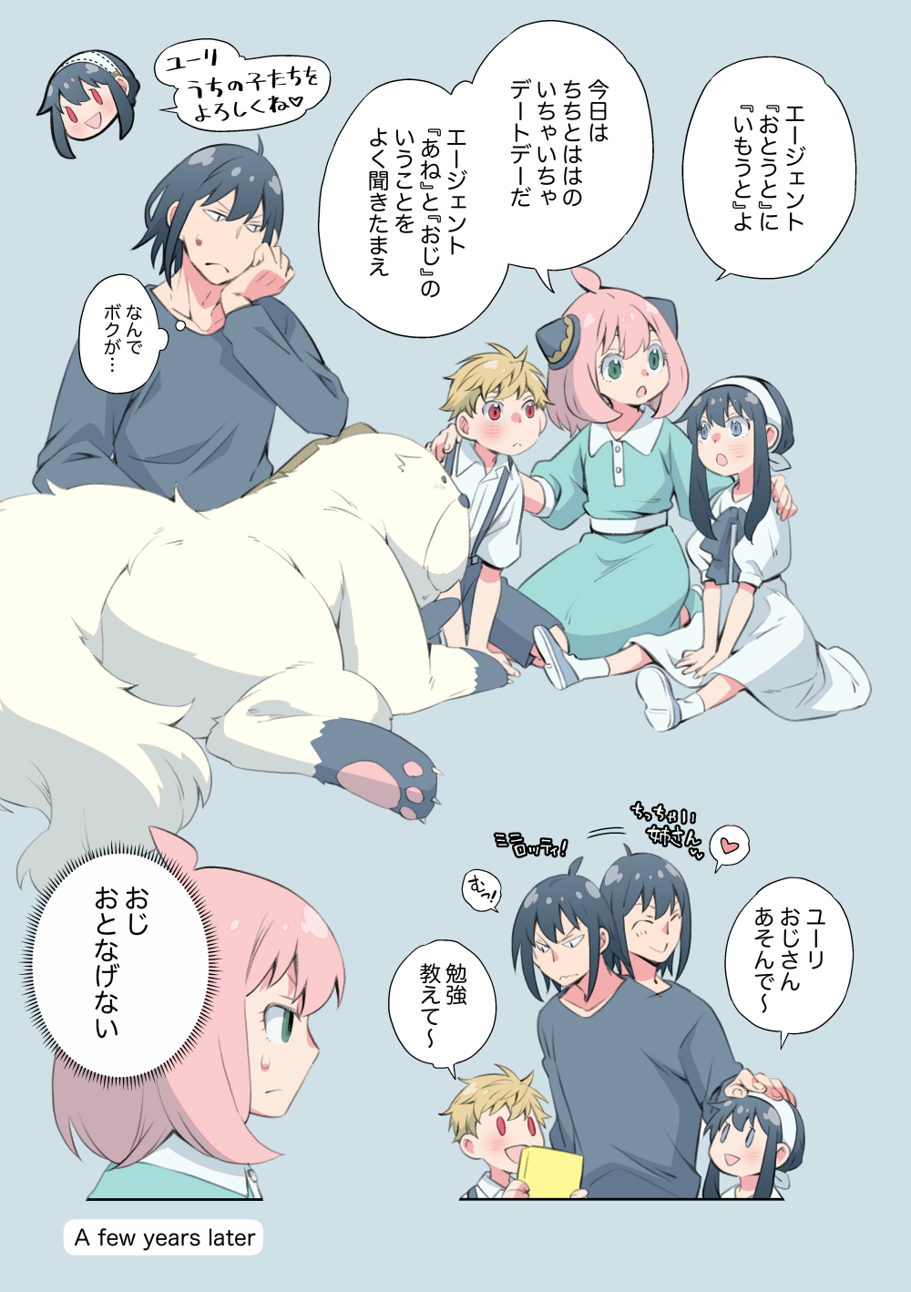 2boys 2girls anya_(spy_x_family) black_hair blonde_hair bond_(spy_x_family) commentary_request dress english_text family great_pyrenees green_dress green_eyes hairband hairpods highres if_they_mated kamimiya long_hair look-alike mixed-language_text multiple_boys multiple_girls open_mouth pink_hair red_eyes siblings spy_x_family translation_request uncle_and_nephew uncle_and_niece white_dress yor_briar yuri_briar