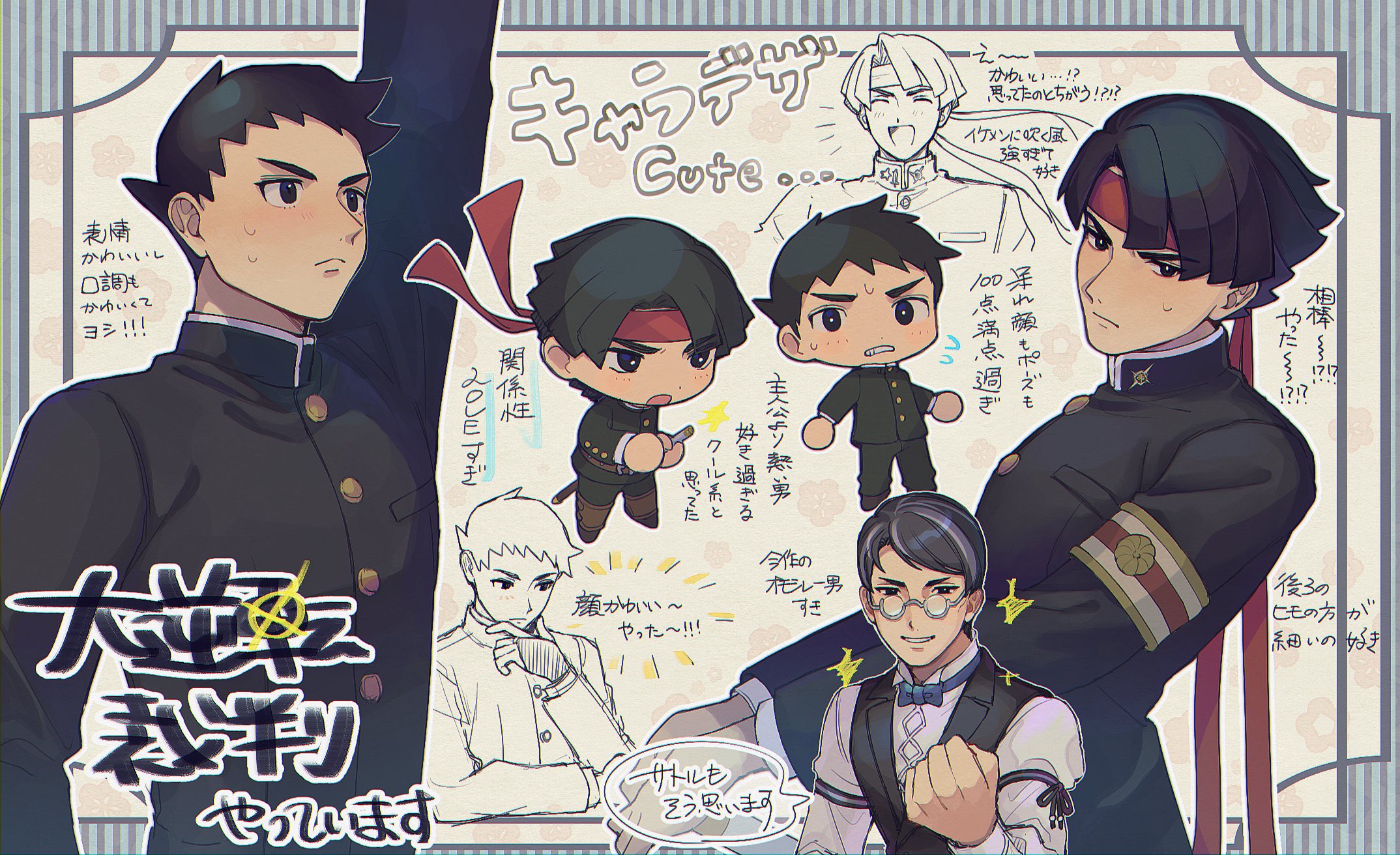 3boys ace_attorney arm_up armband black_eyes black_hair black_jacket black_pants black_vest blue_bow blue_bowtie blush bow bowtie brown_footwear buttons chibi closed_mouth commentary_request copyright_name gakuran glasses headband highres jacket japanese_clothes katana kazuma_asogi long_sleeves looking_at_viewer male_focus multicolored_hair multiple_boys multiple_views open_mouth pants red_headband ryunosuke_naruhodo satoru_hosonaga school_uniform shirt short_hair smile streaked_hair sweatdrop sword the_great_ace_attorney thinking translation_request upper_body vest weapon white_shirt yamunashi