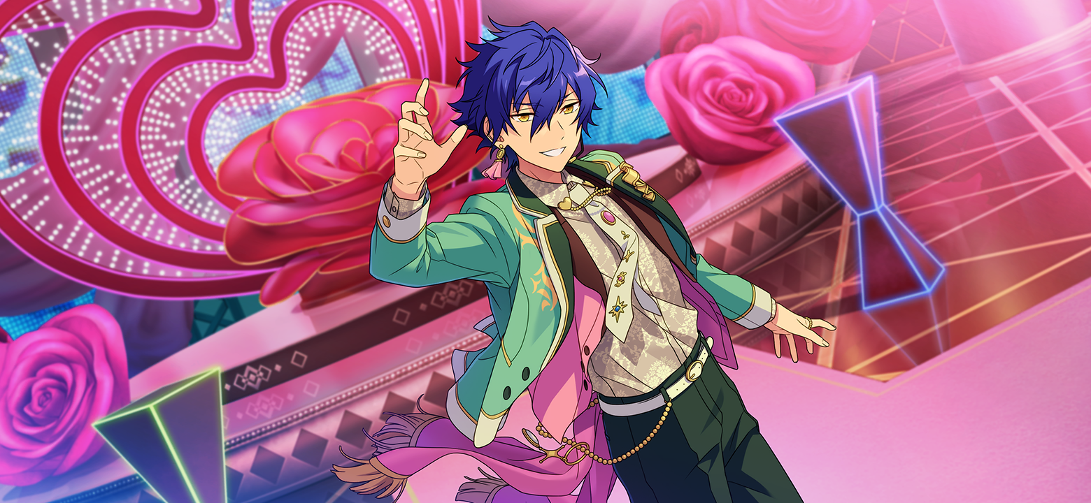 1boy belt belt_buckle blazer blue_hair buckle collared_shirt cowboy_shot dark_blue_hair earrings ensemble_stars! fingernails flower hair_between_eyes happy_elements headset heart jacket jewelry lapels long_sleeves looking_at_viewer male_focus necktie official_art open_clothes open_jacket red_flower red_rose ring rose rouge&ruby_(ensemble_stars!) sazanami_jun shirt short_hair smile solo teeth third-party_source white_belt yellow_eyes