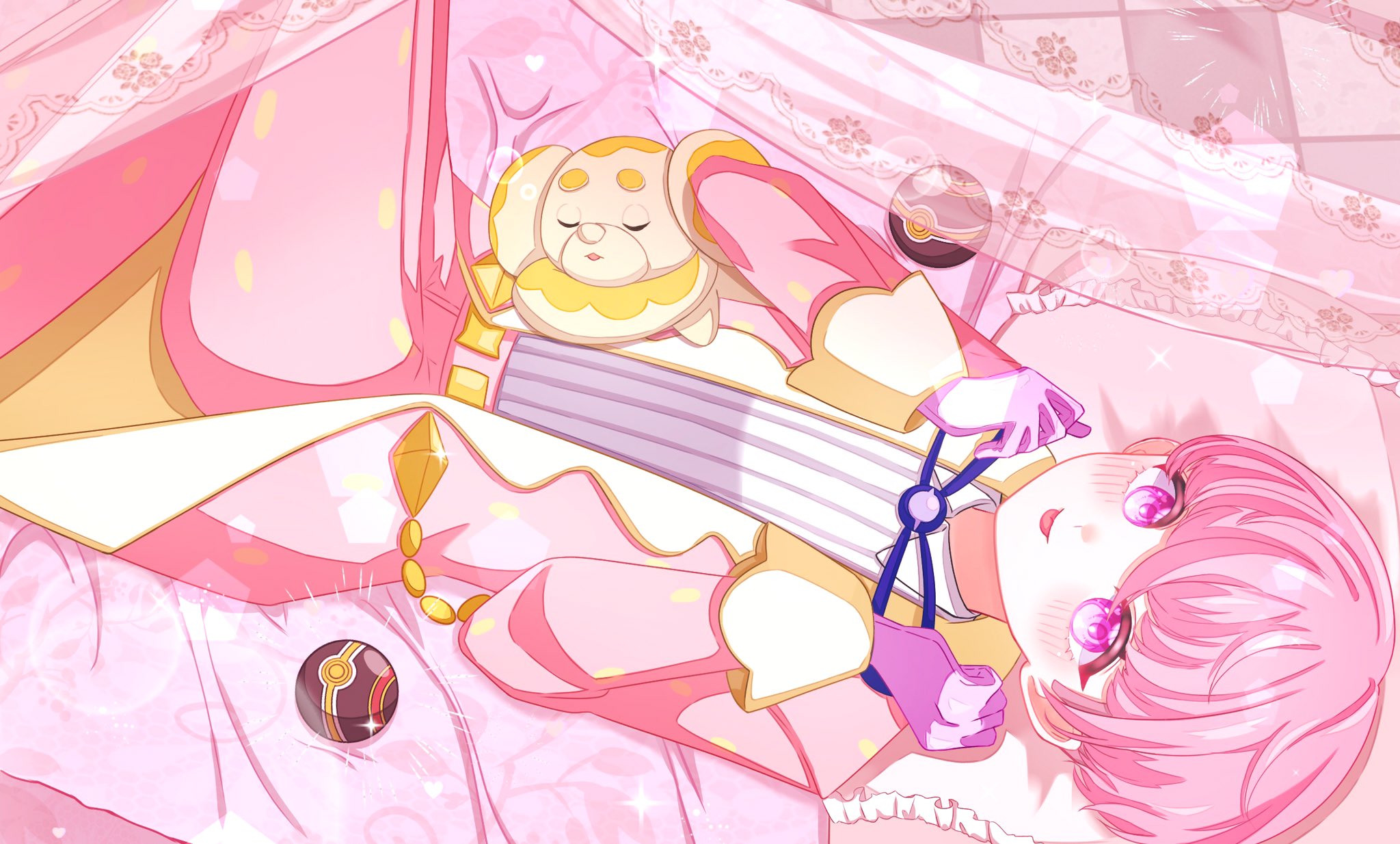 1boy blue_ribbon blush bowl_cut closed_mouth coat commentary_request fidough gloves highres kamicho_musharu looking_at_viewer luxury_ball lying male_focus neck_ribbon nintendo on_back open_clothes open_coat ortega_(pokemon) pants pink_coat pink_eyes pink_hair pink_pants poke_ball pokemon pokemon_(creature) pokemon_scarlet_and_violet ribbon shirt short_hair smile team_star tongue tongue_out trap