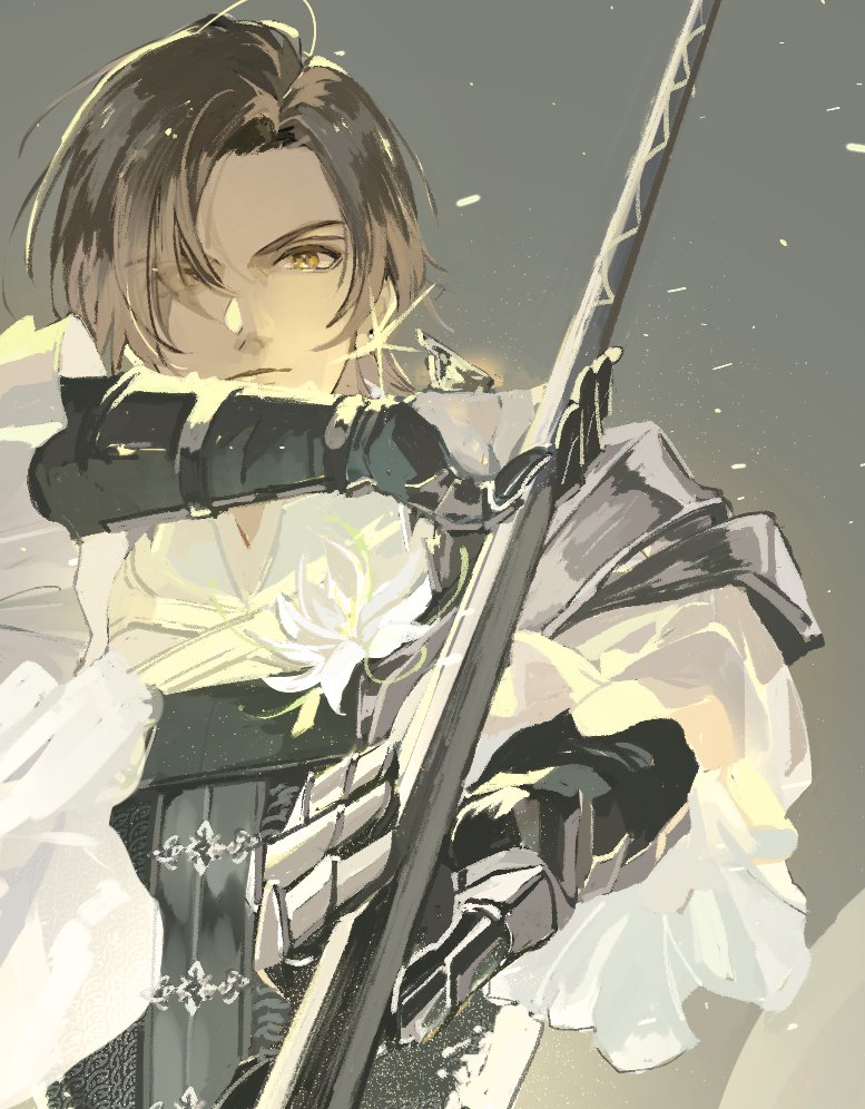 1boy black_gloves brown_hair dion_lesage earrings en_(enxxx) fighting_stance final_fantasy final_fantasy_xvi frilled_sleeves frills gloves grey_background hair_over_one_eye holding holding_polearm holding_weapon jewelry looking_at_viewer male_focus medium_hair parted_bangs polearm shirt solo swept_bangs upper_body weapon white_shirt yellow_eyes