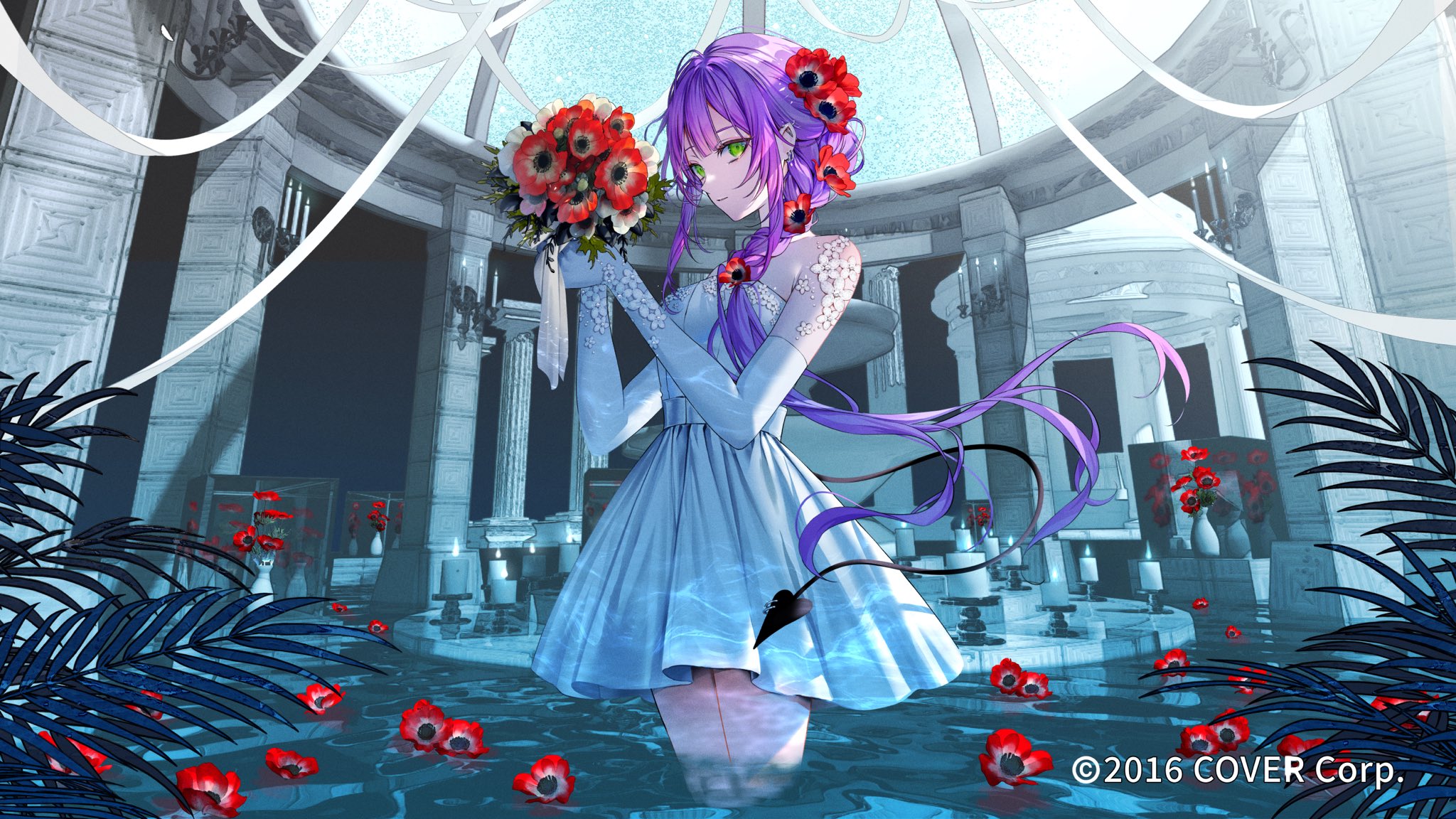 1girl alternate_costume alternate_hairstyle blunt_bangs bouquet braid candle candlestand commentary copyright_name demon_tail dome dress elbow_gloves fern fire fire floral_print flower gloves green_eyes hair_flower hair_ornament highres holding holding_bouquet hololive lace lace-trimmed_dress lace_trim long_hair looking_at_viewer nekoyama_iori pool purple_hair red_flower side_braid sidelocks solo standing tail tokoyami_towa vase very_long_hair virtual_youtuber wading water white_dress