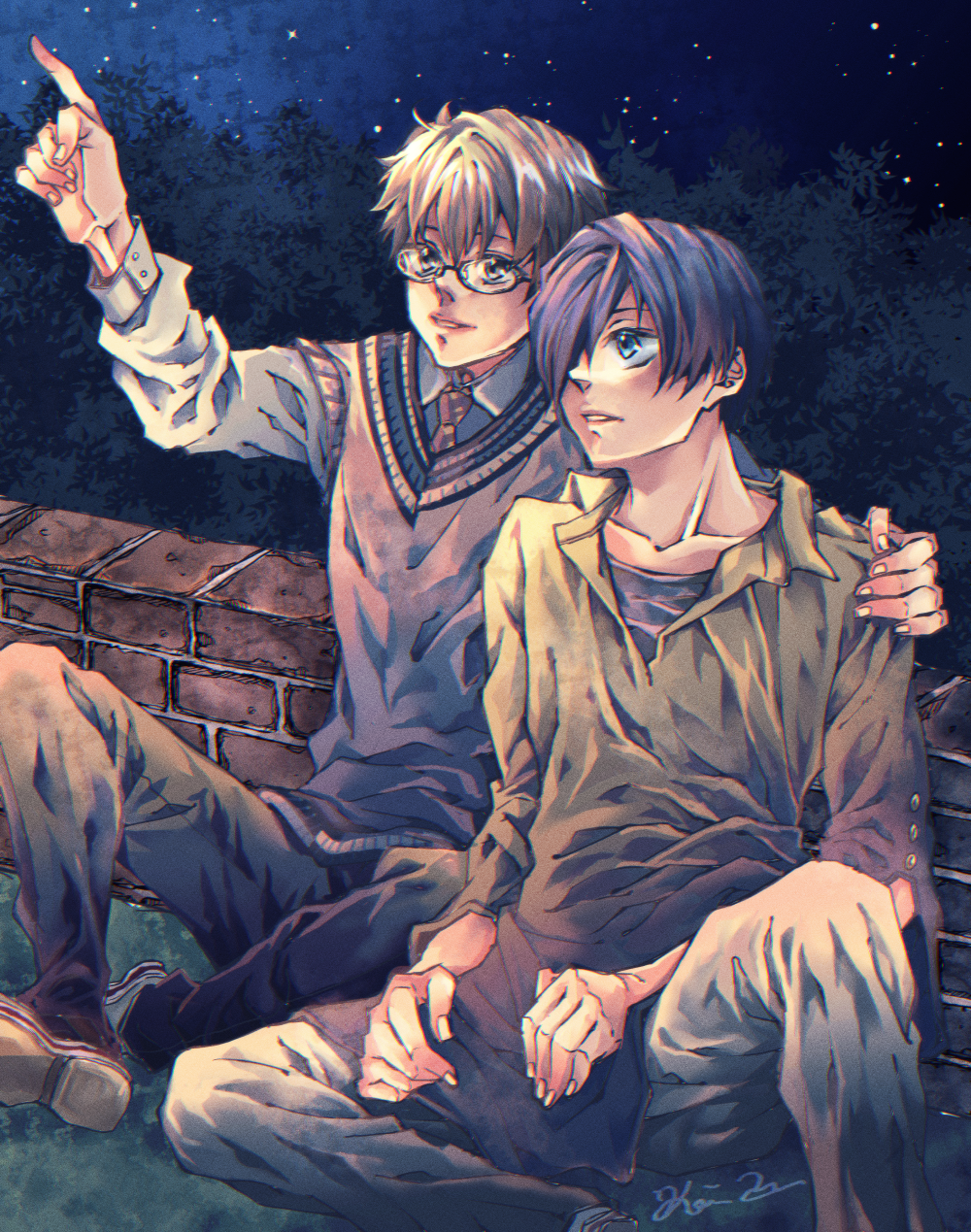 2boys ao_no_orchestra aono_hajime arm_around_shoulder blue_eyes brick_wall glasses hair_over_one_eye highres kei_(aoxxbl) male_focus multiple_boys necktie night outdoors pants pointing saeki_nao_(ao_no_orchestra) shoes sitting sky star_(sky) starry_sky sweater_vest yaoi