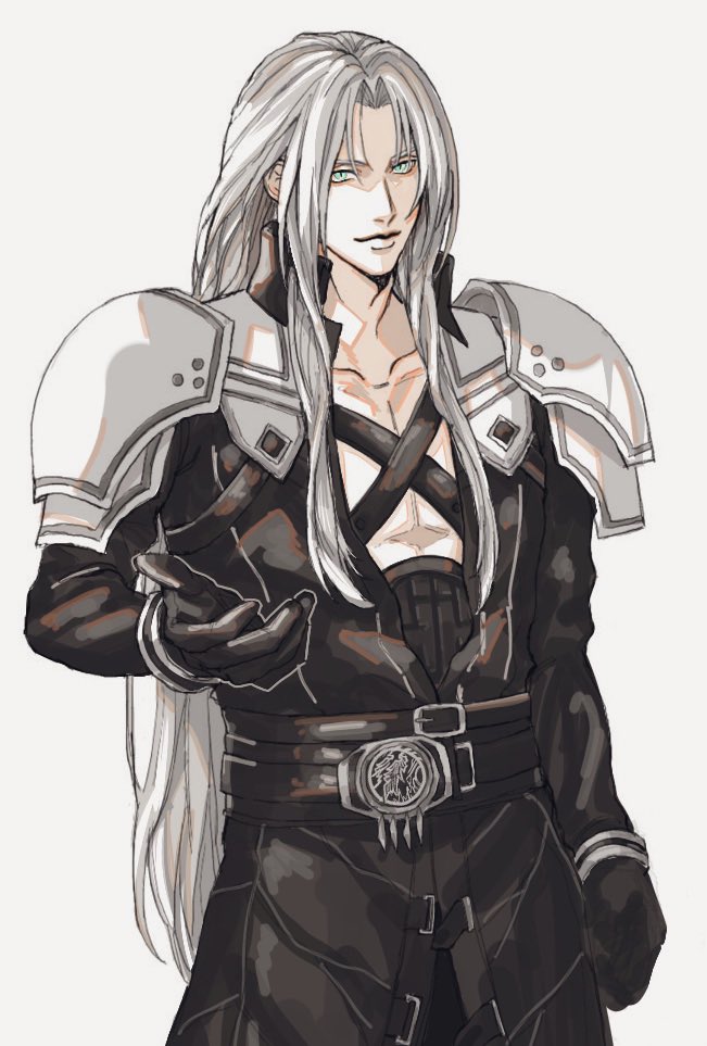 1boy armor belt black_gloves black_jacket chest_strap collarbone cowboy_shot final_fantasy final_fantasy_vii final_fantasy_vii_remake gloves grey_hair high_collar jacket leather leather_jacket light_smile long_coat long_hair long_sleeves looking_at_viewer male_focus multiple_belts outstretched_hand parted_bangs pectorals rkgk_kamonegi sephiroth shoulder_armor slit_pupils solo white_background