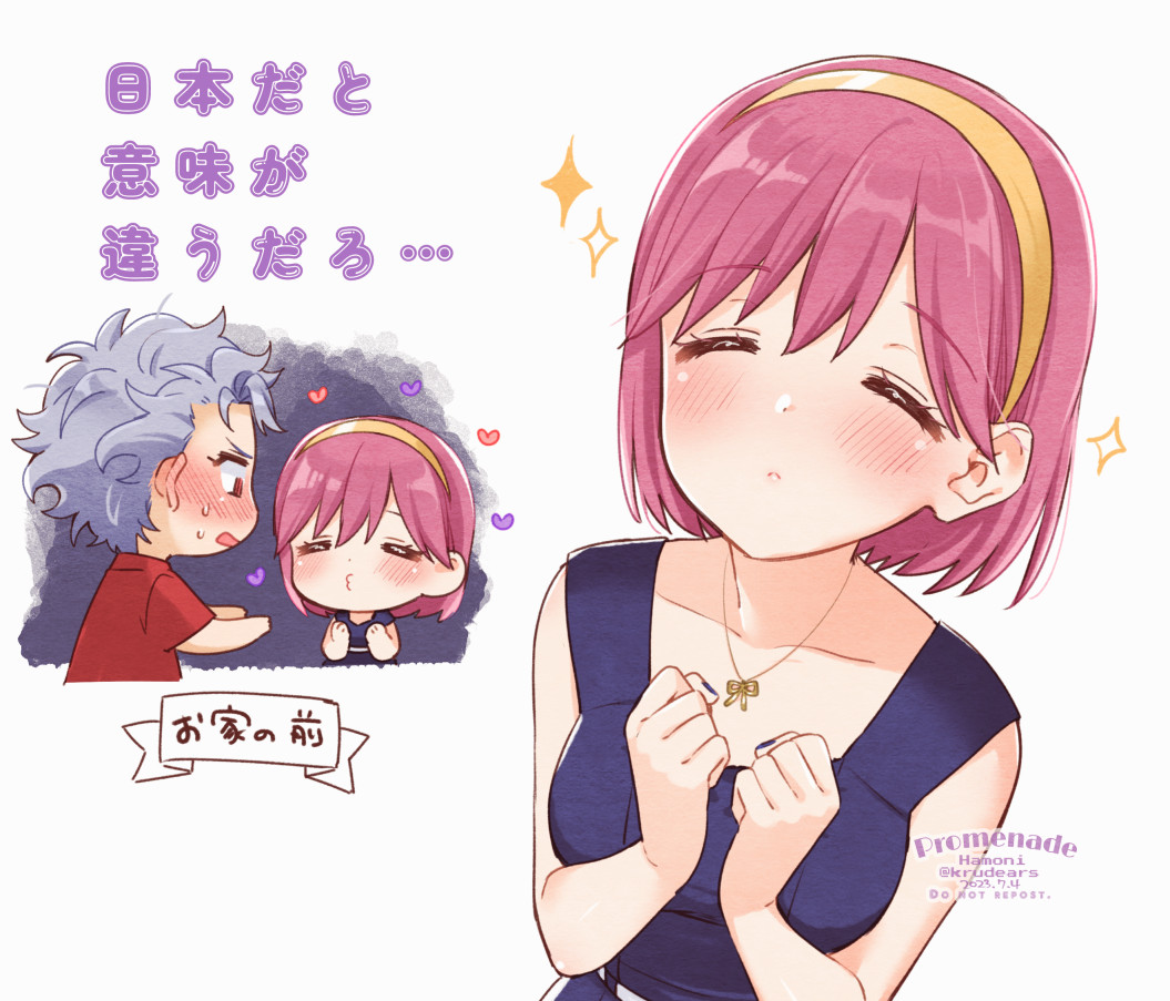 1boy 1girl artist_name bare_arms blue_dress blush bob_cut breasts chibi collarbone dated dress gold_hairband grey_hair hairband heart jewelry krudears medium_breasts necklace pink_hair protagonist_(tokimemo_gs3) puckered_lips red_eyes red_shirt shirt shitara_seiji short_hair short_sleeves sleeveless sleeveless_dress sparkle sweatdrop tokimeki_memorial tokimeki_memorial_girl's_side tokimeki_memorial_girl's_side_3rd_story twitter_username upper_body