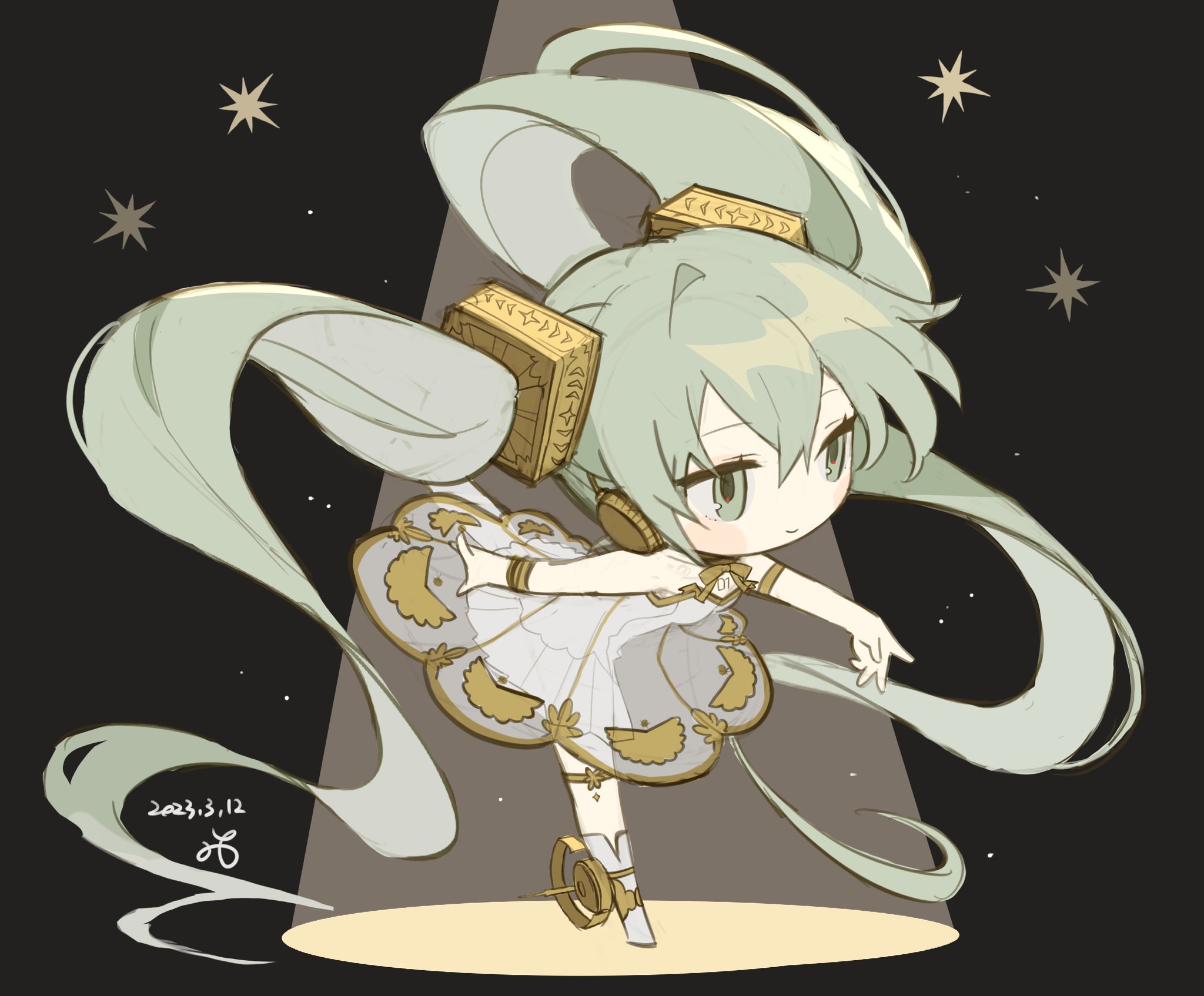 1girl absurdly_long_hair armlet ballet bracelet brown_background chibi dated dress en_pointe floating_hair full_body gramophone_miku hair_ornament hatsune_miku highres jewelry layered_dress light_particles long_hair looking_ahead miku_symphony_(vocaloid) ofgwr outstretched_arms reaching see-through_clothes see-through_dress smile solo spotlight standing standing_on_one_leg strapless strapless_dress very_long_hair vocaloid white_dress white_footwear