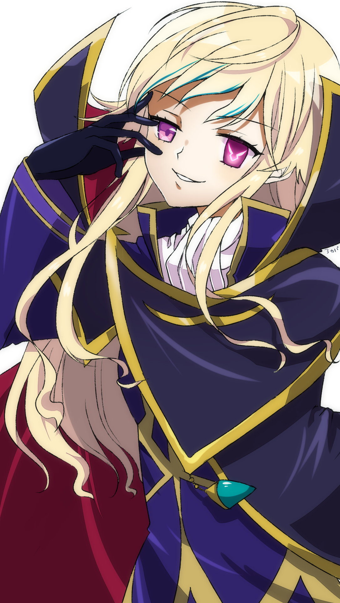 0725akaba 1girl black_cloak black_gloves bloe_phthalo blue_hair cloak gloves hand_up highres himehina_channel jacket long_hair looking_at_viewer multicolored_hair parted_lips purple_jacket shirt simple_background solo streaked_hair suzuki_hina symbol-shaped_pupils upper_body very_long_hair virtual_youtuber white_background white_shirt
