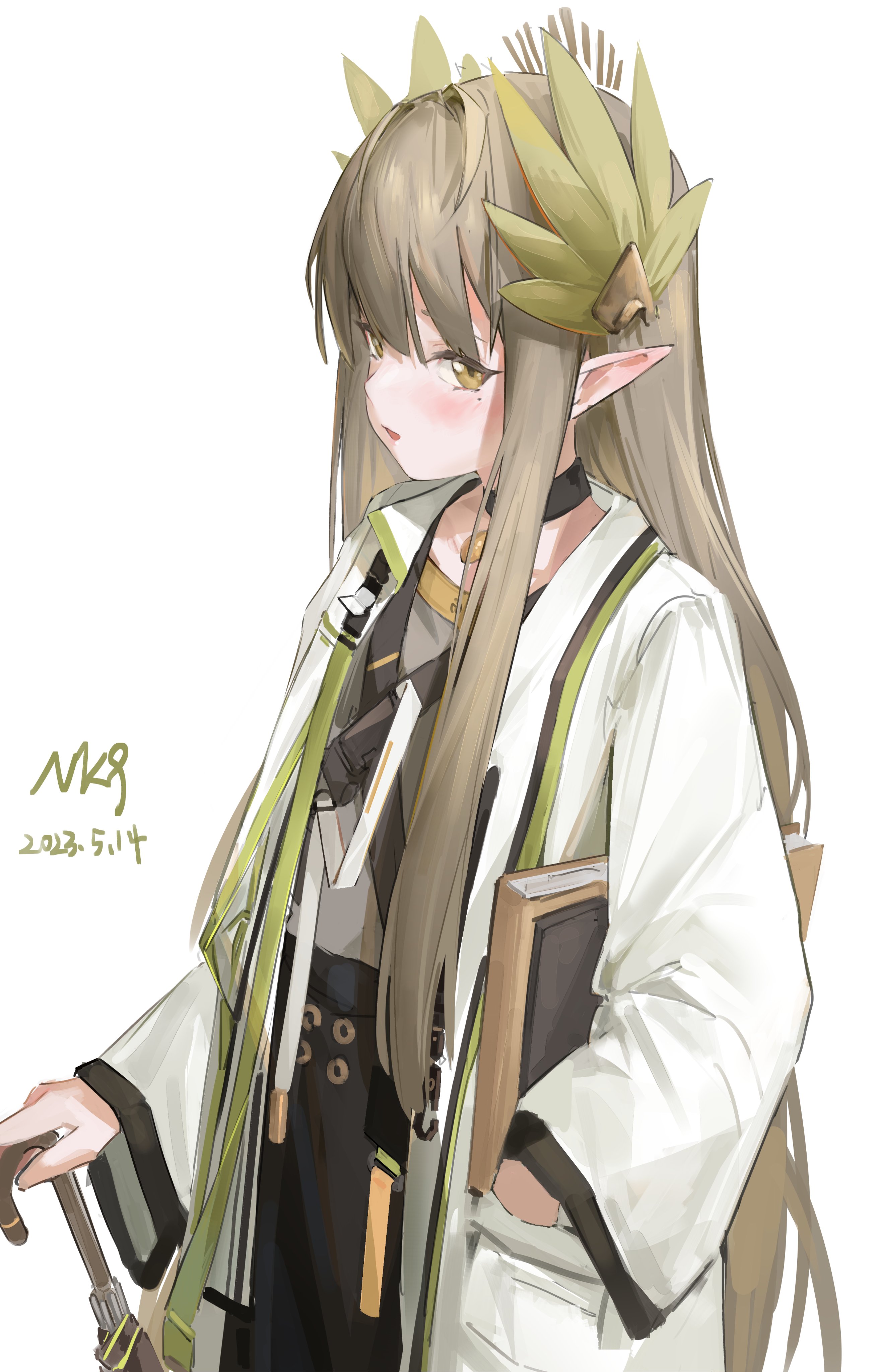 1girl absurdres arknights black_choker blush book brown_eyes choker closed_umbrella coat dated hand_in_pocket highres holding holding_umbrella laurels long_hair long_sleeves looking_at_viewer mole mole_under_eye muelsyse_(arknights) nariku open_clothes open_coat parted_lips pointy_ears simple_background solo umbrella very_long_hair white_background white_coat