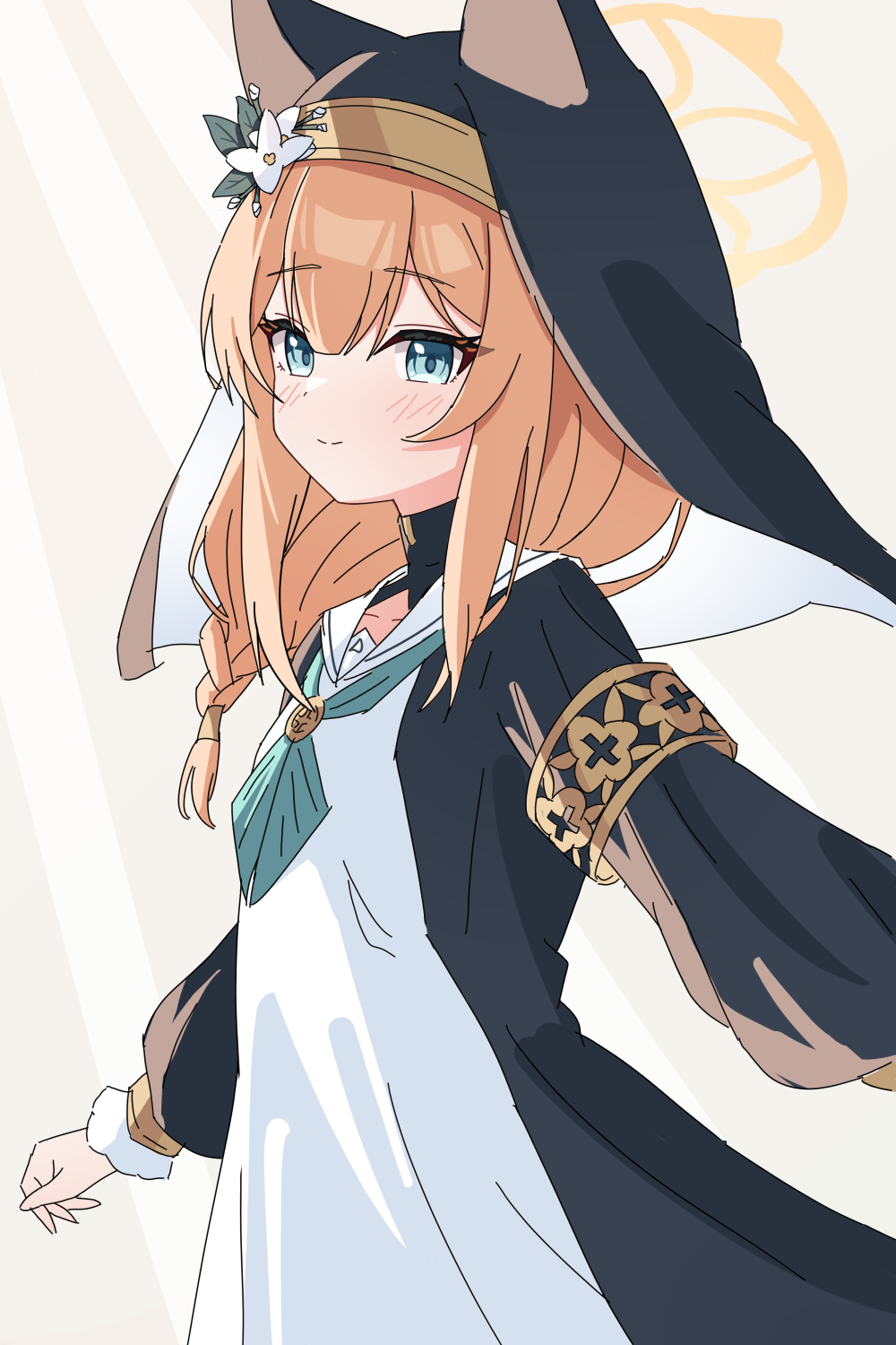 1girl animal_ear_headwear animal_ears aqua_eyes armlet black_jacket blue_archive blue_neckerchief braid closed_mouth coif commentary dress fake_animal_ears floral_print flower hair_flower hair_ornament halo highres jacket jewelry long_hair long_sleeves mari_(blue_archive) neckerchief nonddu nun orange_hair sailor_collar simple_background single_braid smile solo turtleneck upper_body veil white_background white_dress white_sailor_collar yellow_halo